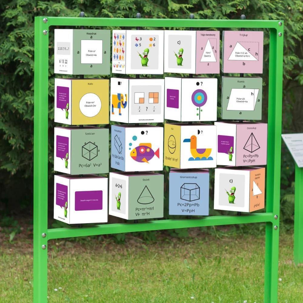 Naukowe place zabaw – Mat-memory Mat-Memory to innowacyjna gra edukacyjna, która zmienia klasyczne memory w angażujące narzędzie do nauki matematyki. Dzięki zastosowaniu obrotowych kostek z czterema stronami dzieci mogą rozwijać pamięć, koncentrację i umiejętności matematyczne w atrakcyjny sposób. Każda strona kostki kryje inne wyzwanie – od wzorów geometrycznych po logiczne łamigłówki – co sprawia, że nauka staje się fascynującą przygodą. Mat-Memory to dobre rozwiązanie dla uczniów szkół podstawowych, którym pomaga lepiej zrozumieć pojęcia matematyczne, a także dla nauczycieli poszukujących skutecznych metod nauczania. Gra ułatwia przyswajanie wzorów na pole i obwód figur geometrycznych, rozwija umiejętność rozwiązywania problemów oraz pozwala na samodzielną kontrolę odpowiedzi, co wspiera proces uczenia się na błędach. Dzięki konieczności dopasowywania elementów dzieci trenują również spostrzegawczość i umiejętność logicznego myślenia. Mat-Memory wyróżnia się spośród tradycyjnych gier edukacyjnych, ponieważ łączy rozwój pamięci z aktywnym treningiem matematycznym. Gra uczy i angażuje, zachęcając do wielokrotnego powtarzania materiału w sposób, który nie nuży, lecz inspiruje do dalszej nauki. Regularna gra w Mat-Memory poprawia zdolności poznawcze dzieci, a także wspiera ich rozwój psychoruchowy. Dzięki różnorodnym zadaniom aktywowane są różne obszary mózgu, co przyczynia się do wzmacniania połączeń nerwowych i usprawnia procesy myślowe. To gra, która łączy zabawę z nauką i zapewnia trening umysłowy. Podana cena dotyczy produktu bez montażu. Wersja z montażem jest wyceniana indywidualnie – zapytania w tej sprawie prosimy kierować na nasz adres mailowy. [ikony-produktu-opisy] Co zawiera? Naukowe place zabaw - Mat-memory Główne informacje Producent: Naukowe Place Zabaw. Wymiary produktu: 145 x 20 cm. Wysokość: 175 cm. Wymiary Strefy bezpieczeństwa: 3,20 m x 4,45 m. Wiek: 5+. Produkt zgodny z EN 1176-1:2017. Pomysły na zabawę Poszukiwacze figur geometrycznych – rozwój umiejętności matematycznych, percepcji wzrokowej, spostrzegawczości Nauczyciel wybiera jeden obrazek z figurami na Mat-memory. Zadaniem dzieci jest odnalezienie w otoczeniu przedmiotów w takich samych kształtach i w tej samej liczbie, co na obrazku. Matematyczna sztafeta – rozwój umiejętności matematycznych, logicznego myślenia, umiejętność rozwiązywania problemów, praca w grupie Gracze dzielą się na drużyny. Każdy członek zespołu kolejno podbiega do Mat-Memory, obraca kostkę i rozwiązuje zadanie. Jeśli odpowiedź jest poprawna, przekazuje pałeczkę kolejnemu graczowi. Drużyna, która ukończy wyzwania jako pierwsza, wygrywa. Instrukcja Procedura montażu