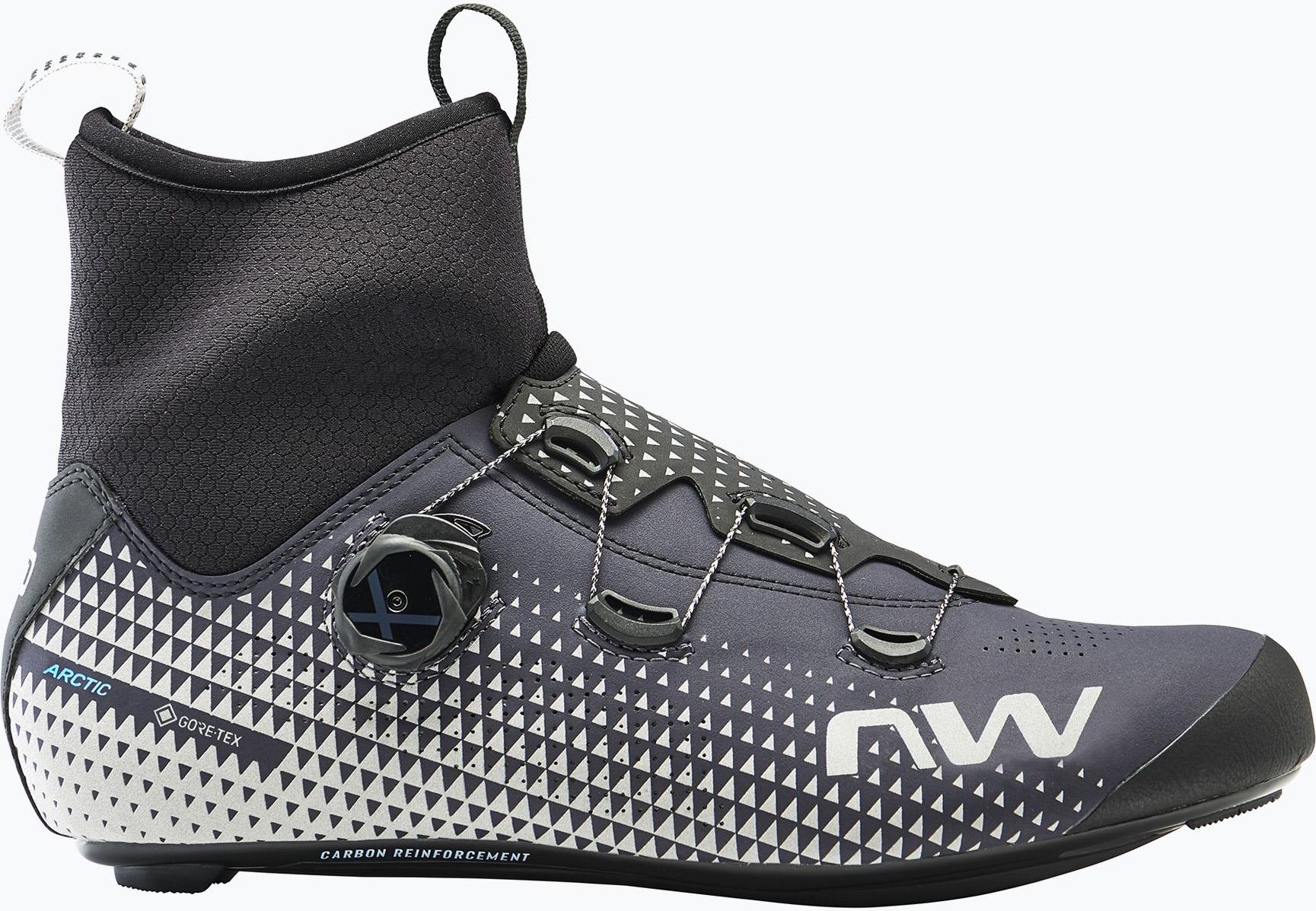 Northwave Celsius R Arctic GTX to zimowe buty na rower szosowy dla tych, którzy nie chcą rezygnować z treningów nawet podczas ekstremalnych warunków pogodowych. Wykonane z wodoodpornej(5/5) i wiatro szczelnej(5/5) membrany Koala Gore-Tex®, która utrzymuje stopy w cieple i doskonale izolują nawet w najzimniejsze dni. Bardzo dobry transfer energii gwarantuje podeszwa NRG Air Carbon o wskaźniku sztywności 8,0 dzięki nowej mieszance nylonu wzmocnionego włóknem szklanym wzbogaconym o carbon. Cholewka z opatentowanym systemem XFrame® i konstrukcja cholewki „na zakładkę” równomiernie otula stopę bez punktów ucisku. Doskonale chroni przed wiatrem i zimnem. Umożliwia doskonałe przeniesienie mocy, eliminując rozpraszanie energii, zmniejsza opór aerodynamiczny. Systemem SLW3, to łatwy i intuicyjny mechanizm, który umożliwia milimetrową regulację dopasowania buta nawet podczas jazdy i w zimowych rękawiczkach. Wzmocniony i odporny na ścieranie obszar palców, gwarantuje że but posłuży wiele sezonów. Nowy kołnierz Easyfit wykonany z niezwykle elastycznej membrany Gore-Tex Rattler® i wysoce izolującego neoprenu zapewnia bardzo dużą swobodę ruchów, oraz maksymalną ochronę przed niekorzystnymi warunkami pogodowymi. Ergonomiczny kształt pięty z anatomicznym dopasowaniem udoskonalony dzięki najnowszej technologii termo-formowanego podporu w połączeniu z wkładką Arctic 4Layer wykonanej z Aluminium Eva+ i polaru Eva+ zapewnia doskonałą izolację termiczną. Model Celius R Artic GTX pokryty jest odblaskowymi wstawkami, które zwiększają widoczność i bezpieczeństwo na drodze szczególnie podczas słabszej widoczności.