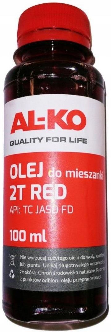 Stan magazynowy zwykle 400 sztuk (nowe i używane). Posiadamy autoryzację serwisu Briggs&Stratton, dzięki której świadczymy usługi napraw gwarancyjnych i pogwarancyjnych. Firma BARAS bazuje na najwyższych wartościach, którą stanowi Klient i jego potrzeby! Olej czerwony do dwusuwu 2T RED 100 ml AL-KO Olej czerwony do smarowania silników dwusuwowych, chłodzonych powietrzem. Chroni przez zatarciem silnika spalinowego, zużyciem i korozją. Aby urządzenie było prawidłowe eksploatowane, należy przestrzegać proporcji mieszanki zgodnie z zaleceniami producenta. Informacje o proporcji mieszanki znajdziemy w instrukcji obsługi każdego silnika spalinowego. API: TC JASO FD Zastosowanie: silniki pilarek łańcuchowych silniki podkaszarek i kos spalinowych urządzenia ogrodnicze z silnikami dwusuwowymi - patrz instrukcja obsługi silnika nr produktu: 113650