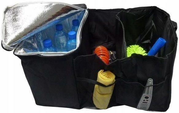 Organizer do bagażnikaOrganizer do bagażnika z 3 pojemnymi przegrodami, w tym jedna z izolacją termiczną.Z boku wyposażony z praktyczne kieszonki na drobiazgi.Wymiary: 54 x 40 x 26 cmStan: Nowy