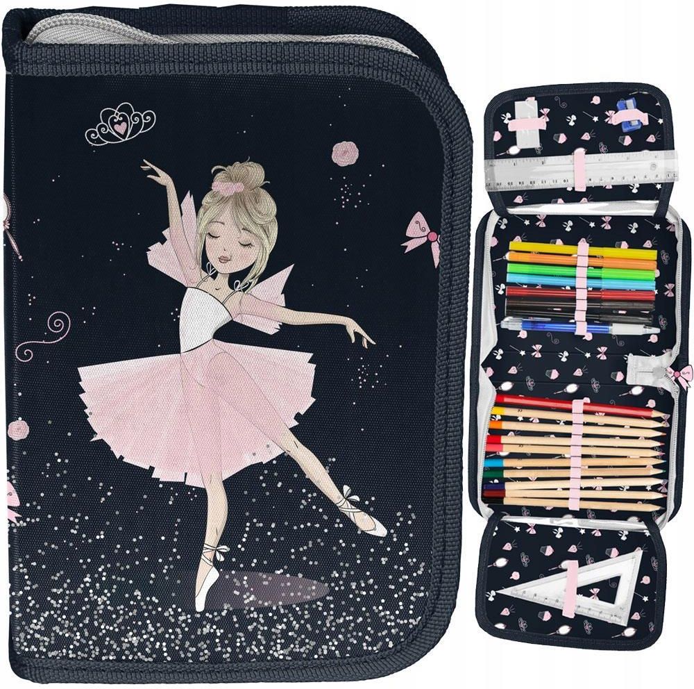Paso Piórnik Dwuklapkowy z Wyposażeniem Balet PP24DN-P001 Klasyczny piórnik jednokomorowy, rozkładany, z dwoma klapkami wewnątrz. Bogato zdobiony. Piórnik pomieści najpotrzebniejsze akcesoria szkolne. W skład wyposażenia wchodzi: długopis ołówek 7 pisaków 9 ekologicznych kredek temperówka gumka do mazania linijka ekierka Wymiary: 19,5x13x3,5cm Waga: 250g