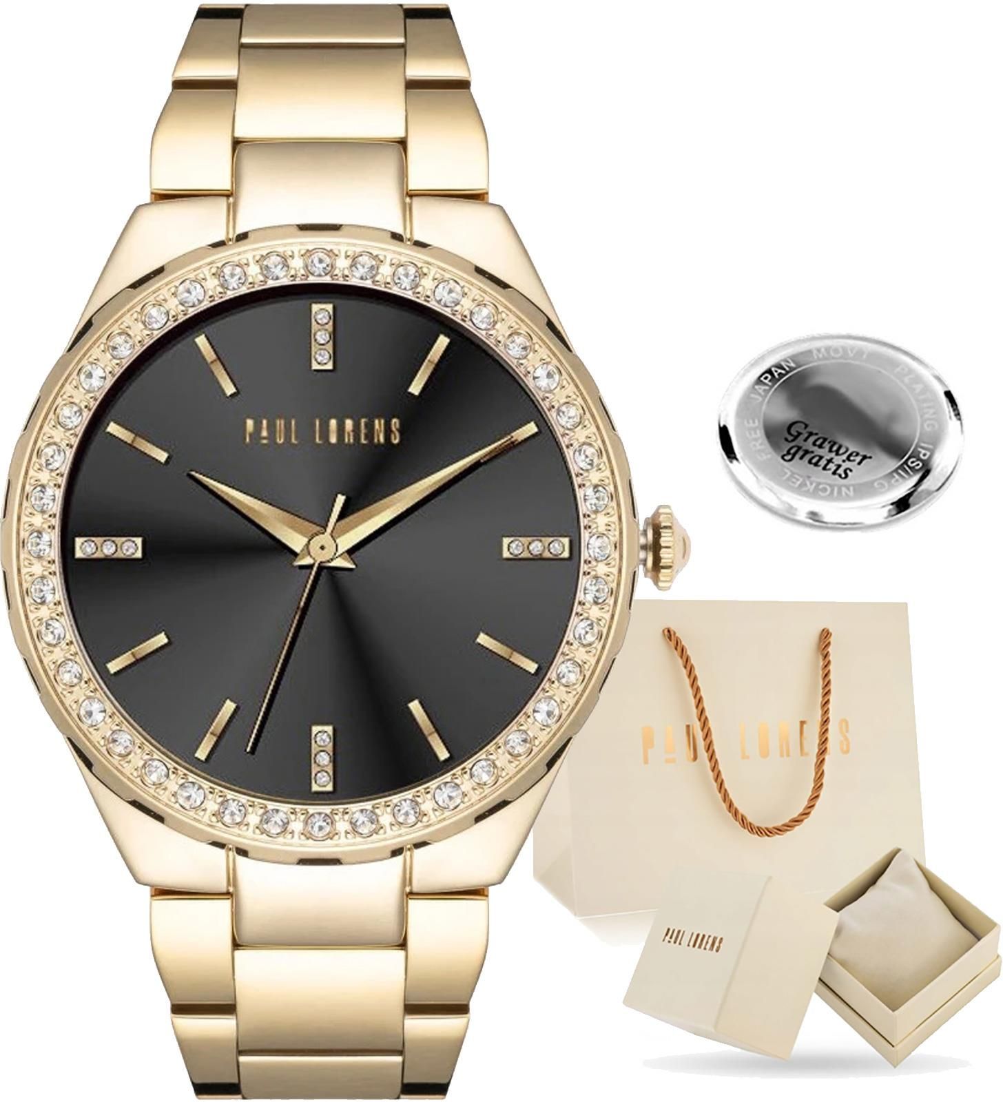 Zegarek damski Paul Lorens Model Carmen wyposażony został w niezawodny japoński mechanizm kwarcowy, który współdziałając z baterią zapewnia bardzo dokładne odmierzanie czasu. Koperta zegarka została pokryta utwardzaną powłoką IPS/IPG. Tarcza tego zegarka bardzo czytelna. Całość zamontowana została stalowej na bransolecie pokrytej powłoką IPS/IPG. Wodoszczelność na poziomie 30m (3ATM) gwarantuje, że nie trzeba obawiać się drobnych zachlapań. Zdecydowanie nie jest to jednak zegarek przeznaczony do pływania lub nurkowania. DARMOWY GRAWER ============================================= Najlepiej wpisać treść graweru w uwagach do zamówienia. Wygrawerowany zegarek nie traci gwarancji, jednak nie można już go zamienić ani zwrócić. Zamówienie usługi grawerowania wiąże się z przedpłatą, zatem wyklucza to możliwość skorzystania z opcji zapłaty za pobraniem. Przydatne informacje dotyczące grawerowania Dedykacja umieszczana jest na tylnej części zegarka - na dekielku - jest to najbardziej odpowiednie miejsce. Zegarek z grawerem to idealny pomysł na prezent. Grawerowanie laserowe ma kolor czarny dzięki czemu napis jest widoczny i wyraźny. Napisy naniesione są poziomo W przypadku ograniczonego miejsca istnieje konieczność naniesienia graweru na napisy znajdujące się na deklu, nie ma to wpływu na widoczność graweru. Czcionka domyślna to Monotype corsiva. Co może znajdować się na grawerze i jak może wyglądać? Limit tekstu to +/- 25 znaków, jest to liczba wystarczająca do przekazania treściwej dedykacji lub podpis obdarowującego. Kocham Cię ♥ Kochanej Żonie / Mamie / ... [xx].[xx].[xxxx] Niech odmierza wspaniałe chwile Mechanizm: W zegarku osadzony został japoński mechanizm kwarcowy Miyota. Pasek/bransoleta: Bransoleta stalowa, IPS/IPG Koperta: Metalowa, IPS/IPG. Szkiełko: Mineralne. Tarcza: Sygnowana logiem producenta. Wodoszczelność: Water Resist 3 BAR (30M) zegarek jest odporny na przypadkowe zachlapania wodą np. podczas mycia rąk. Kolorystyka: Tarcza: kolor czarny, Wskazówki: kolor złoty, Koperta: kolor złoty, Bransoleta: kolor złoty. Gwarancja: Pisemna 12 miesięcy. Wymiary: koperta: szer 34mm x wys 36 mm, grubość koperty: 10 mm, szerokość bransolety przy kopercie: ok. 20 mm, pozostała część: 16 mm maksymalny obwód: ok. 19,5 cm. Co jest w zestawie? Oryginalny zegarek Paul Lorens ✔ Instrukcja obsługi w języku Polskim ✔ Dowód zakupu