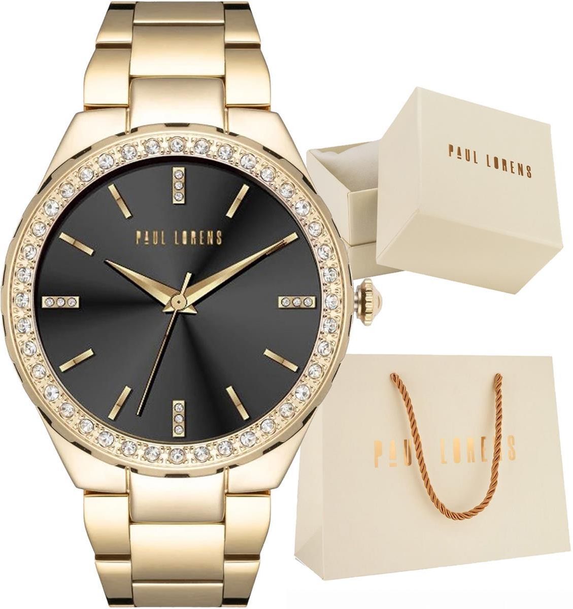Zegarek damski Paul Lorens Model Carmen wyposażony został w niezawodny japoński mechanizm kwarcowy, który współdziałając z baterią zapewnia bardzo dokładne odmierzanie czasu. Koperta zegarka została pokryta utwardzaną powłoką IPS/IPG. Tarcza tego zegarka bardzo czytelna. Całość zamontowana została stalowej na bransolecie pokrytej powłoką IPS/IPG. Wodoszczelność na poziomie 30m (3ATM) gwarantuje, że nie trzeba obawiać się drobnych zachlapań. Zdecydowanie nie jest to jednak zegarek przeznaczony do pływania lub nurkowania. Mechanizm: W zegarku osadzony został japoński mechanizm kwarcowy Miyota. Pasek/bransoleta: Bransoleta stalowa, IPS/IPG Koperta: Metalowa, IPS/IPG. Szkiełko: Mineralne. Tarcza: Sygnowana logiem producenta. Wodoszczelność: Water Resist 3 BAR (30M) zegarek jest odporny na przypadkowe zachlapania wodą np. podczas mycia rąk. Kolorystyka: Tarcza: kolor czarny, Wskazówki: kolor złoty, Koperta: kolor złoty, Bransoleta: kolor złoty. Gwarancja: Pisemna 12 miesięcy. Wymiary: koperta: szer 34mm x wys 36 mm, grubość koperty: 10 mm, szerokość bransolety przy kopercie: ok. 20 mm, pozostała część: 16 mm maksymalny obwód: ok. 19,5 cm. Co jest w zestawie? Oryginalny zegarek Paul Lorens ✔ Instrukcja obsługi w języku Polskim ✔ Dowód zakupu