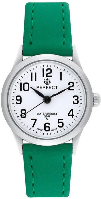 Damski dziecięcy mały klasyczny okrągły czytelny zegarek Perfect LXC048S-11 - metalowa koperta w kolorze srebrnym, zielony skórzany pasek, biała tarcza czasomierza, kontrastowe cyfry i wskazówki, klasa szczelności 30M. Japoński mechanizm kwarcowy