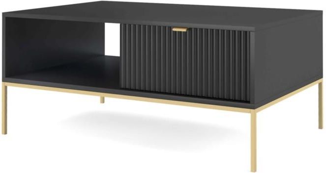 Model: NOVA L104 Kolor: Czarny / rama złota Wymiary: Szerokość 104 cm Wysokość 46 cm Głębokość 68 cm Wykonanie: Produkt do samodzielnego montażu Kształt prostopadłościanu Wysuwana szuflada Dekoracyjne karbowanie na froncie Stabilna sprawdzona konstrukcja Stylowe wysokie metalowe nóżki w złotym …