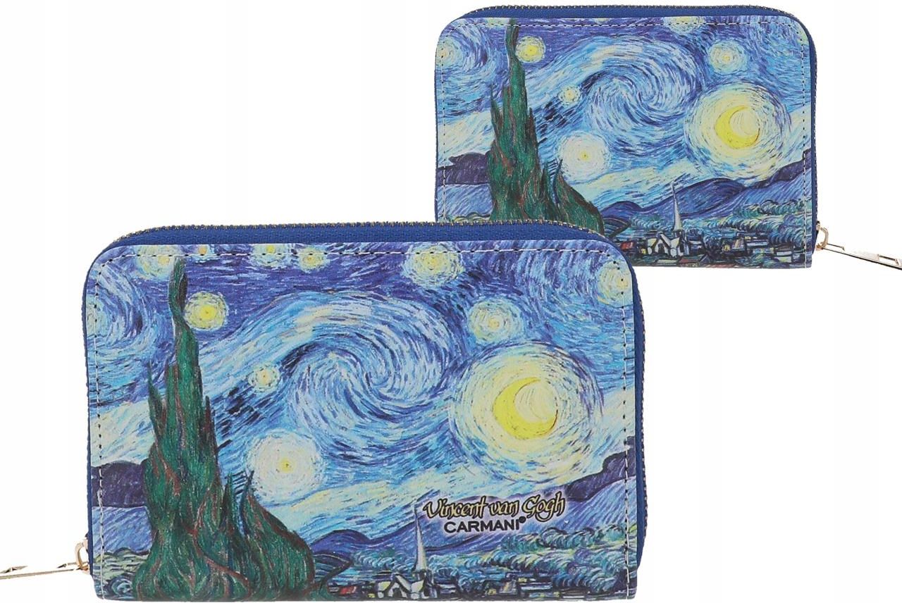 Portfel na zamek suwak Van Gogh Gwiaździsta noc carmani (14229) Portfel zapinany na suwak, ozdobiony motywem z obrazu Vincenta Van Gogha "Gwiaździsta noc" marki Carmani. Duży i dobrze zorganizowany - tak można określić ten portfel. Posiada przegródki na banknoty, karty płatnicze, wizytówki oraz …