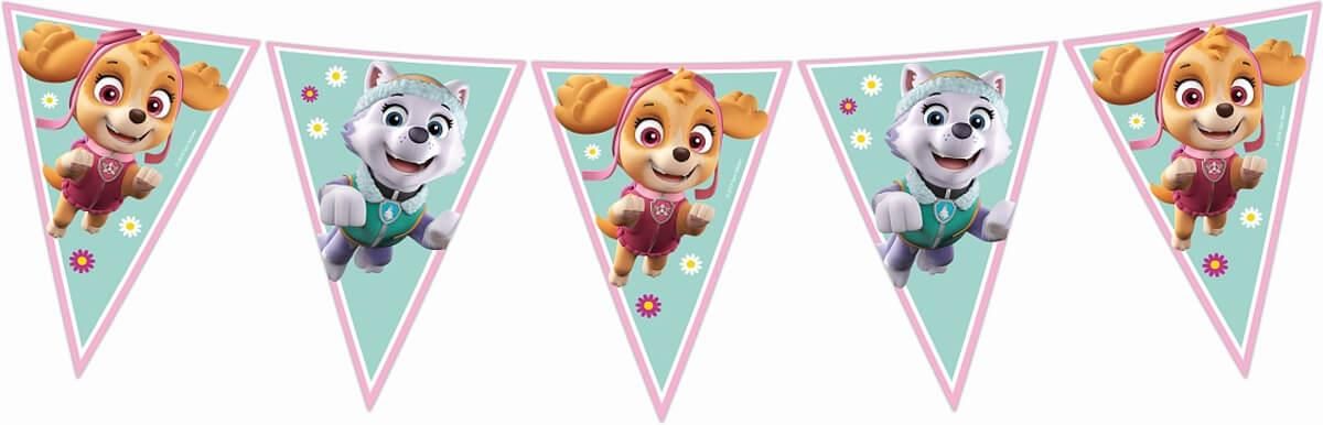 Banner flagi Psi Patrol Skye and Everest Skye, Everest oraz Marshall zabiorą Was w bajeczną podróż Psiego Patrolu! Baner w formie flag idealnie sprawdzi się na każdej dziecięcej imprezie! Kolory pastelowe są subtelne, ale bardzo eleganckie! Szeroki baner umożliwi ozdobienie pokoju w którym odbywa się impreza! Tematyka Psiego Patrolu ucieszy małych gości :) Długość baneru: 230cm Wymiary jednej flagi: ok. 18cm x 26cm Rok wydania: 2022 Oprawa: blister