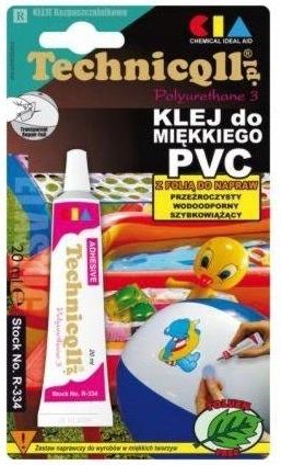 PARAMETRY Kolor: bezbarwny Czas otwartego schnięcia: 5 min. Pełne utwardzenie: 12 h Odporność na temp: -30°C do 80°C Okres ważności : 24 miesiące CECHY elastyczny, bezbarwny, nie zawiera toluenu i cykloheksanu, klei pod wodą, odporny na UV i temperaturę, odporny na rozcieńczone kwasy, zasady, oleje. ZASTOSOWANIE Klej Do Miękkiego PVC służy do klejenia elastycznego PCV, poliuretanu, tkanin powlekanych. Typowe zastosowanie obejmuje: naprawa dmuchanych zabawek, naprawa materacy, płaszczy przeciwdeszczowych, naprawa plandek samochodowych, naprawa basenów (klejenie pod wodą). KORZYŚCI do naprawy elementów cienkościennych, tworzy niewidoczne spoiny, bezpieczny w użyciu, naprawa basenów bez konieczności wypuszczania wody, do naprawy plandek. SPOSÓB UŻYCIA A. Łączenie elementów Nanieść klej na obydwie powierzchnie i równomiernie go rozprowadzić. Odczekać do odparowania rozpuszczalników (około 5 min. w temperaturze 18°C). Mocno docisnąć klejone elementy i pozostawić do całkowitego wyschnięcia. B. Zaklejanie pęknięć/otworów Z dołączonej folii wyciąć łatkę o owalnym kształcie (wielkość należy dobrać tak, aby zakrywała naprawianą powierzchnię z min. jednocentymetrowym naddatkiem). Dalsze czynności tak jak w punkcie A. C. Zaklejanie otworów pod wodą Z dołączonej folii wyciąć łatkę o owalnym kształcie (wielkość należy dobrać tak, aby zakrywała naprawianą powierzchnię z min. jednocentymetrowym naddatkiem). Nanieść klej na łatkę, równomiernie go rozprowadzić i natychmiast docisnąć do naprawianego miejsca. Dokładnie wygładzić naniesioną łatkę i usunąć nadmiar kleju. Uwaga: w przypadku klejenia pod wodą spoina może być mętna. TECHNICQLL Klej do miękkiego PVC - 20 ml Wodoodporny klej do naprawy cienkościennych materiałów wykonanych z elastycznych tworzyw sztucznych – PVC, poliuretanu, tkanin powlekanych.