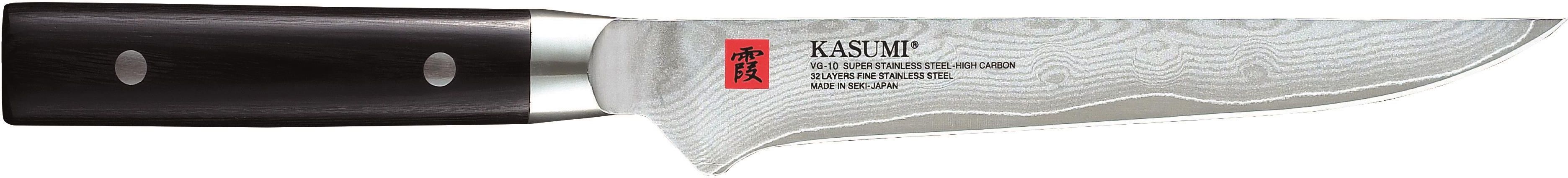Nóż do trybowania 16 cm Nóż do trybowania to narzędzie stworzone specjalnie do oddzielania mięsa od kości. Dzięki swojemu długiemu, zakrzywionemu ostrzu, umożliwia precyzyjną pracę, pozwalając łatwo przesuwać się wzdłuż kości. Nasze noże z serii VG-10 PRO to połączenie najnowszych technologii wytwarzania z tradycją mistrzów KASUMI, kultywowaną przez 25 pokoleń. Ostrze tego noża wykonane jest z japońskiej monolitycznej wysokowęglowej stali VG-10, co gwarantuje znakomitą twardość na poziomie 59-60 stopni w skali Rockwella. Dzięki unikalnej technologii produkcji osiągamy wyjątkową ostrość, przewyższającą większość dostępnych na rynku noży. Stal VG-10 PRO jest elastyczna i odporowa na pękanie. Rękojeść wykonana z twardego drewna pakka jest nie tylko bardzo wygodna, ale także nadaje nożowi estetyczny wygląd. To narzędzie, które nie tylko ułatwia pracę, ale też wnosi do Twojej kuchni element tradycji i sztuki rękodzielniczej. Noże KASUMI są produkowane w mieście SEKI, położonym w środkowej Japonii, które słynie z produkcji najwyższej jakości noży. Tradycja wytwarzania noży, a wcześniej mieczy, w tym regionie sięga XIII wieku, kiedy sławny mistrz Motoshige przeniósł się do Seki, aby wytwarzać najwyższej jakości miecze, które były pożądane w całej Japonii. Region ten stanowił idealne miejsce do produkcji ze względu na odpowiednią jakość ziemi do hartowania ostrzy, dostęp do węgla drzewnego, czystą wodę oraz bliskość dwóch rzek. Unikalna metoda hartowania ostrza gwarantuje niezwykłą jakość i wysokie walory estetyczne, co sprawia, że miecze z Seki były ulubionymi mieczami samurajskimi. Dziedzictwo mistrzowskiego kunsztu jest przekazywane z pokolenia na pokolenie, a noże KASUMI bez wątpienia są specjalnością Seki. Cechy produktu Ostrze: - Materiał ostrza: stal damasceńska - Liczba warstw stali: 32, skuwane na gorąco - Twardość: 59-61 HRC - Ozdobne dwustronne wykończenie ostrza - Bardzo wysoka ostrość noża Rękojeść: - Materiał rękojeści: twarde drewno pakka - Niska waga, co sprawia, że jest łatwy i wygodny w użytkowaniu. https://youtu.be/mQlCK_FD5pA?si=Cz1wwpsRPwSewVTj ► Kasumi Marka Kasumi ma długą historię i specjalizuje się w produkcji wysokiej jakości noży kuchennych. Oto kilka informacji o różnych kolekcjach noży Kasumi: Kolekcja KASUMI TORA: Noże z tej kolekcji posiadają rękojeść z drewna magnolii wykończoną czarną powłoką epoksydową, która zapewnia pewność chwytu. Ostrze jest wykonane ze stali nierdzewnej Daido 1K6, która jest twarda (58/59 HRC). Kolekcja Black Hammer: Noże Black Hammer to rzemieślniczo kute noże produkowane w limitowanych ilościach. Wykonane są ze stali Aogami / Blue Paper Steel, tradycyjnej japońskiej stali węglowej wzbogaconej chromem i wolframem (62 HRC). Te noże wymagają specjalnej konserwacji i kontrolowanego użytkowania, ponieważ nie są nierdzewne. Rękojeść wykonana jest z drewna wiśni. Kolekcja VG-10 PRO: Noże VG-10 PRO wykonane są z monolitycznej stali wysokowęglowej VG-10. Ta stal zapewnia większą odporność na odkształcenia i pękanie niż stal damasceńska. Rękojeść wykonana jest z polimerów, a stal VG-10 PRO jest odporna na wilgoć i korozję. Kolekcja VG-10 HM: Noże VG-10 HM są kute pod naciskiem 300 ton, co sprawia, że stal jest mocniejsza i nieprzywierająca. Rękojeść jest wykonana z żywicy poliacetalowej. Ostrza tych noży mają twardość 59-60 Rockwell. Kolekcja z 32 warstwami stali damasceńskiej: Noże z tej kolekcji charakteryzują się pięknym wzornictwem, 32 warstwami stali damasceńskiej i twardością rdzenia wynoszącą 59-61 HRC. Rękojeść wykonana jest z drewna pakka, które jest trwałe i wygodne w użyciu. Kolekcja KASANE: Kolekcja Kasane wyróżnia się delikatnością i lekkością, z subtelnie wykończonymi drewnianymi rękojeściami ze szlachetnego drewna dzikiej wiśni. Noże z powłoką tytanową: Te noże posiadają powłokę tytanową, która wzmacnia i chroni ostrza ze stali molibdenowo-wanadowej. Są wyjątkowo ostre, odporne na działanie chemiczne i kwasy, a ich rękojeści z polipropylenu są odporne do 90°C. Noże Kasumi wyróżniają się wysoką jakością, precyzją wykonania i różnymi rodzajami ostrzy, które mogą być dostosowane do różnych celów kulinarnych. Są idealnym narzędziem zarówno dla profesjonalnych kucharzy, jak i miłośników gotowania. Wybór noża zależy od Twoich preferencji i potrzeb kuchennych. Warto zadbać o właściwą konserwację noży, aby utrzymać je w doskonałej kondycji.