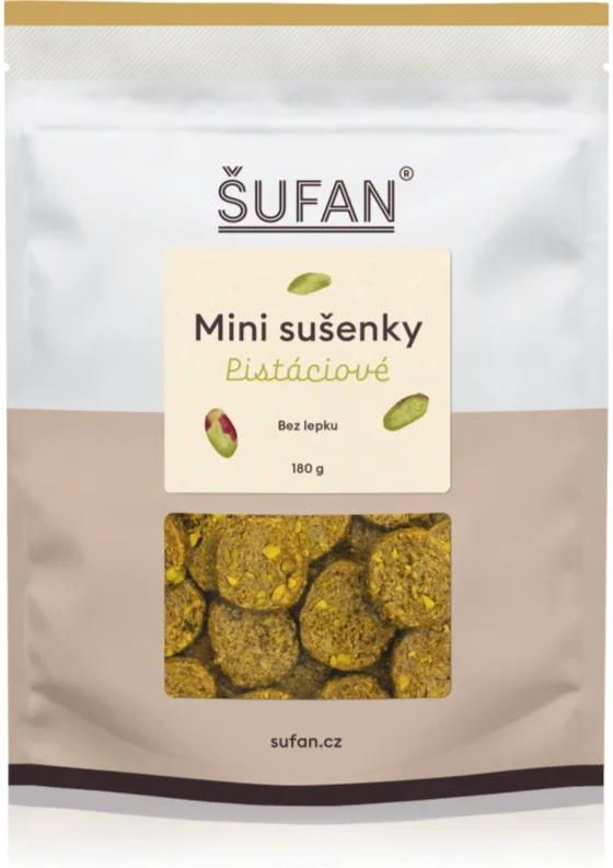 Šufan Mini sušenky Pistáciové, 180 g, Żywność bezglutenowa dla mężczyzn, Czeka Cię pracowity dzień w pracy, ciężki trening lub po prostu masz ochotę zjeść coś pysznego? Ciastka Šufan Mini sušenky Pistáciové pomogą wyrównać poziom energii i zachwycą Twoje podniebienie. Właściwości: z wysokiej jakości surowców idealna przekąska w podróży, w pracy i po treningu źródło błonnika bez glutenu