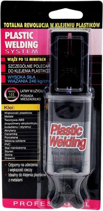Plastic Welding klej do plastików 25 ml Najlepszy na rynku klej do profesjonalnego łączenia wszelkiego rodzaju powierzchni, szczególnie plastików. Posiada unikalne składniki używane przy produkcji plomb dentystycznych, co pozwala uzyskać najwyższą jakość i trwałość wiązania. Łączy ze sobą "na zawsze" większość plastików i tworzyw sztucznych, metali a także ceramikę, porcelanę, włókno szklane, szkło, drewno i wiele innych materiałów. Zaczyna wiązać już po 4 minutach. Po 15 minutach można poruszać klejonymi przedmiotami. Pełną wytrzymałość uzyskuje już po 1 godzinie. Po 24 godzinach spoina wytrzymuje 238 atmosfer (246kg/cm2). W temperaturze poniżej +13° C czas utwardzania ulega wydłużeniu. Odporność temperaturowa od -40°C do +93°C. Jest wodoodporny. Doskonale wypełnia drobne szczeliny. Nie wiąże plastików wykonanych z polietylenu i polipropylenu. Przechowywać w temp. od +1°C do +24°C. Sposób użycia Przed użyciem klejone powierzchnie nie wymagają specjalistycznego przygotowania, wystarczy, że będą suche, czyste lekko zmatowione. Specjalny typ dozownika pozwala na precyzyjne odmierzenie obu składników. Należy odłamać końcówkę strzykawki, wycisnąć żądana ilość epoksydu, cofnąć tłoczek, dokładnie wymieszać za pomocą łopatki i nanieść na klejoną powierzchnię. Po użyciu wytrzeć do czysta końcówki strzykawki. Strzykawkę należy zamykać zawsze w ten sam sposób, aby nie dopuścić do zmieszania się jednego składnika z drugim. Ostrzeżenia AKTYWATOR: Niebezpieczeństwo: Wysoce łatwopalna ciecz i pary. Działa drażniąco na skórę. Może powodować reakcję alergiczną skóry. Może powodować podrażnienie dróg oddechowych. Chronić przed dziećmi. Dokładnie umyć ręce po użyciu. Stosować rękawice ochronne/ ochronę oczu. W PRZYPADKU KONTAKTU ZE SKÓRĄ (lub z włosami): Natychmiast zdjąć całą zanieczyszczoną odzież. Spłukać skórę pod strumieniem wody [lub prysznicem]. W PRZYPADKU DOSTANIA SIĘ DO OCZU: Ostrożnie płukać wodą przez kilka minut. Wyjąć soczewki kontaktowe, jeżeli są i można je łatwo usunąć. Nadal płukać. Zawartość/ pojemnik usuwać do pojemnika na odpady. Zwiera: metakrylan metylu. KLEJ: Niebezpieczeństwo: Wysoce łatwopalna ciecz i pary. Powoduje poważne oparzenia skóry oraz uszkodzenia oczu. Może powodować reakcję alergiczną skóry. Może powodować podrażnienie dróg oddechowych. Działa szkodliwie na organizmy wodne, powodując długotrwałe skutki. Chronić przed dziećmi. Dokładnie umyć ręce po użyciu. Stosować rękawice ochronne/ ochronę oczu. W PRZYPADKU KONTAKTU ZE SKÓRĄ (lub z włosami): Natychmiast zdjąć całą zanieczyszczoną odzież. Spłukać skórę pod strumieniem wody [lub prysznicem]. W PRZYPADKU DOSTANIA SIĘ DO OCZU: Ostrożnie płukać wodą przez kilka minut. Wyjąć soczewki kontaktowe, jeżeli są i można je łatwo usunąć. Nadal płukać. Zawartość/ pojemnik usuwać do pojemnika na odpady. Zawiera: metakrylan metylu; kwas akrylowy; hydronadtlenek kumenu.