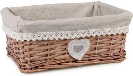 WIKLINOWY KOSZYK Z MATERIAŁEM 25x15x10 cm Koszyk wiklinowy z materiałem jest praktyczny i dekoracyjny. Wiklinowy koszyk możesz wykorzystać w kuchni, salonie, łazience, garderobie i pokoju dziecka, czyli tak naprawdę w każdym pomieszczeniu w domu – w zależności od uznania. Koszyk nie tylko porządkuje włożone do niego rzeczy codziennego użytku, ale także ładnie ozdabia miejsce, w którym się znajduje. Połączenie wikliny z materiałem obszytym koronką sprawia, że koszyk prezentuje się dobrze zarówno w nowoczesnym wnętrzu (nieco je przełamując), jak i w bardziej tradycyjnej aranżacji – w tym przypadku z kolei idealnie ją dopełniając. Specyfikacja Wymiary koszyka*: długość zewnętrzna: 25 cm szerokość zewnętrzna: 15 cm wysokość: 10 cm Cechy produktu: wykonany z naturalnego materiału: wikliny rękodzieło w środku materiał wykończony białą koronką ozdobne serduszko w razie zabrudzenia wyściółkę można wyjąć i wyczyścić przeznaczenie: przechowywanie, koszyk na owoce, koszyk na drobiazgi, koszyk prezentowy, dekoracja i wiele innych * wymiary mogą się nieznacznie różnić od podanych ze względu na ręczne wykonanie z naturalnego materiału