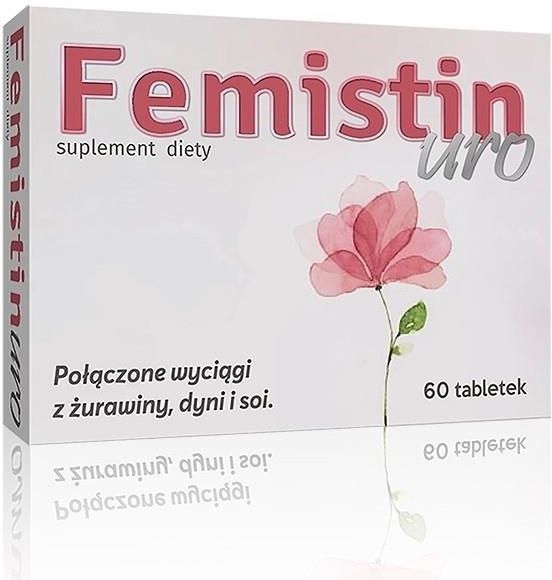 Opis Femistin URO to suplement diety zawierający mieszankę składników, które korzystnie wpływają na funkcjonowanie układu moczowego oraz odpornościowego. Dawkowanie Zalecane spożycie: 1 tabletka 2 razy dziennie. Tabletkę należy połknąć popijając wodą. Przeciwwskazania Nie stosować w przypadku nadwrażliwości na którykolwiek ze składników. Skład Zawartość w 1 tabletce: Ekstrakt z pestek dyni - 260 mg, Ekstrakt z owoców żurawiny wielkoowocowej - 50 mg, Ekstrakt z kiełków soi - 25 mg, w tym: izoflawony sojowe 40% - 10 mg, Ekstrakt z liści pokrzywy zwyczajnej - 25 mg, Witamina D - 2,5 mcg (50% RWS*), Witamina B12 - 1,25 mcg (50% RWS*). *%RWS – referencyjna wartość spożycia Składniki: ekstrakt z pestek dyni DER 10:1; substancja wypełniająca: celuloza mikrokrystaliczna; ekstrakt z owoców żurawiny wielkoowocowej DER 20:1; ekstrakt z nasion soi standaryzowany na 40% izoflawonów; ekstrakt z liści pokrzywy zwyczajnej DER 10:1; substancje przeciwzbrylające: sole magnezowe kwasów tłuszczowych, dwutlenek krzemu; witaminę D (cholekalcyferol); witaminę B12 (cyjanokobalamina).