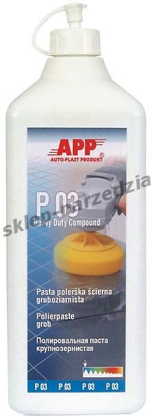 Pasta polerska ścierna gruboziarnista 600g APP P03 Heav Duty Compound (indeks 081301) Pasta Polerska P03 jest bezsilikonową gruboziarnistą emulsją polerską, składającą się z niezwykle skutecznych cząstek ściernych oraz niearomatycznych węglowodorów rozpuszczonych w wodzie. Dzięki użyciu wzajemnie do siebie dopasowanych komponentów antyadhezyjnych, pasta P03 gwarantuje maksymalną intensywność ścierania. Przeznaczona jest do polerowania ręcznego jak i maszynowego. Usuwa miejscowe defekty lakieru powstałe w trakcie lakierowania pojazdu, defekty powierzchni starych powłok lakierniczych spowodowane czynnikami mechanicznymi lub termicznymi.