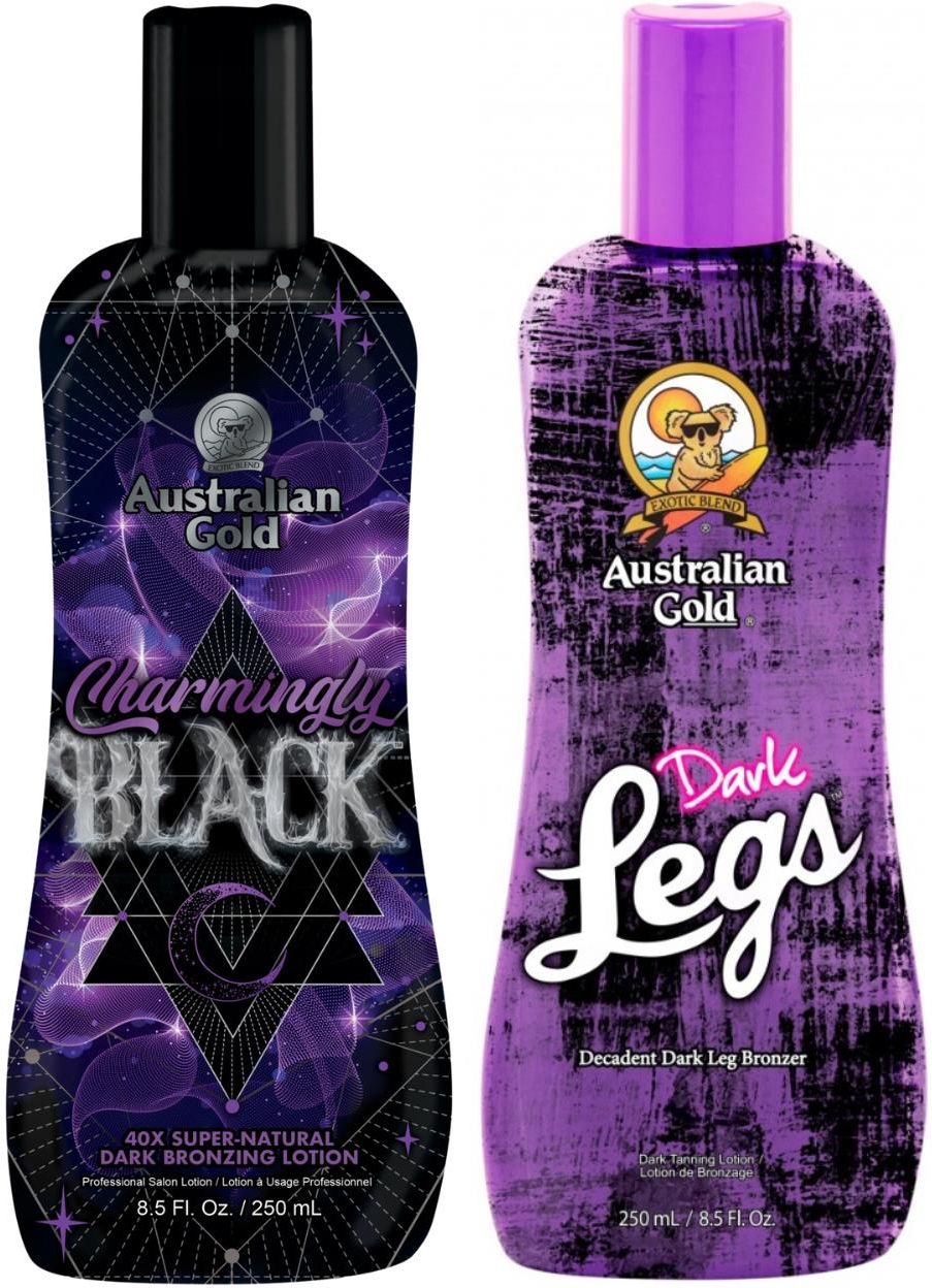 Australian Gold Charmingly Black + Dark Legs Do NógAustralian Gold Charmingly BlackPodkręć swój kolor i nadaj mu jeszcze ciemniejszy odcień dzięki temu 40-krotnemu Super-Natural Bronzer.Do opalania w solarium jak i na słońcu!Karmel i czarny orzech zapewniają natychmiastowe rezultaty, a Ekstrakt z Dzikiego Indygo to dodatkowy impuls do wytworzenia jeszcze szybciej tropikalnej opalenizny.Potion of Protection (ekstrakt z jagód, kofeina i gliceryna) zwalcza wolne rodniki i przeciwdziała powstaniu drobnych linii i zmarszczek.Silnie skoncentrowany olej z nasion konopi doskonale nawilża i zapewnia promienny, młody wygląd.Eliksir Witamin (witaminy A, B5 i E) łagodzi i dogłębnie odżywia.Kompleks Pielęgnacyjny (Szafran i Oliwa z oliwek) przyczynia się do wytworzenia ciemnego koloru i rewitalizuje skórę.Olejek z Australijskiego Drzewa Herbacianego zapobiega niechcianemu zapachowi „po opalaniu”. Zapach „Tropical Mist”.Pojemność: 250mlAustralian Gold Dark Legs Balsam Do Opalania Nóg 250mlDark Legs to produkt stworzony specjalnie z myślą o trudno opalających się nogach.Dzięki naturalnej formule „LEGit Bronzers” uzyskasz w ekspresowym tempie przepięknie opalone nogi.Nowy „Silky Softness Complex” sprawi, że Twoje nogi będą gładkie i miękkie w dotyku, a kompozycja „Perfection Blend”ujędrni skórę.Dark Legs zawiera substancje brązujące o natychmiastowym i o opóźnionym działaniu, aby zapewnić ciemną, równą opaleniznę, która utrzyma się wyjątkowo długo.Zapach: Fruity Floral Właściwości:Ekspresowo opalone nogiNogi gładkie i miękkie w dotykuFormuła ujędrniająca skórę