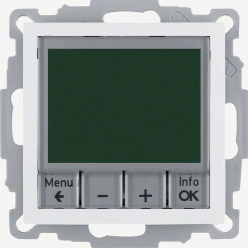 Regulator temperatury z czujnikiem napowietrznym, w kolorze Biały mat, z serii B.3/B.7, o numerze katalogowym 20441909, producenta Berker by Hager. Regulator temperatury z czujnikiem napowietrznym jest przeznaczony do regulacji temperatury w pomieszczeniach, w których zastosowano dowolny typ ogrzewania (podłogowe, grzejnikowe). Do kompletu wymagana ramka z wybranej serii. możliwość ustawienia licznika godzin pracy lub wskaźnika zużycia energii z funkcją ochrony przed zamarzaniem z funkcją ochrony zaworów zegar do czasowego sterowania zmianami temperatury z ochroną dostępu przełączanie tryb ręczny/automatyczny z wbudowanym czujnikiem temperatury program urlopowy aktywowany wg daty 3 bloki dzienne: pn.-pt., sob.-nd., pn.-nd. możliwość programowania ze zdjętym elementem obsługowym maks. 9 czasów przełączania na dzień tygodnia możliwość indywidualnego dostosowania 3 wstępnie ustawionych programów z samouczącą się krzywą grzania do ogrzewania pomieszczeń i podłogi w przypadku ogrzewania podłogowego regulacja jest możliwa poprzez temperaturę pomieszczenia i/lub podłogi do ogrzewania lub klimatyzacji możliwość wyboru regulacji metodą PWM lub 2-punktowej (wł./wył.) możliwość ustawienia czasu cykli PWM i histerezy (przy regulacji 2-punktowej) możliwość ustawienia rodzaju napędu zaworu (zamknięty/otwarty w stanie bezprądowym) możliwość podłączenia zewnętrznego czujnika temperatury