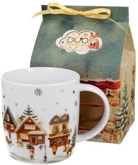 Wśród ośnieżonych uliczek, gdzie z kominów unosi się zapach cynamonu i pieczonych jabłek, a w oknach migoczą świąteczne światełka, rozkwita urokliwa kolekcja Christmas Village marki Duo. Ten niezwykły kubek o pojemności 420 ml (liczonej po rant) wykonany został z eleganckiej porcelany New Bone, która zachwyca delikatnym połyskiem i wyjątkową trwałością. Jego powierzchnię zdobi malownicza zimowa wioska – pełna ciepła, spokoju i rodzinnego uroku. W tle połyskują złote, migoczące gwiazdy, a każdy szczegół dekoracji przenosi myślami do magicznych świąt spędzanych przy blasku choinki. 🎄 Kubek doskonale sprawdzi się podczas chłodnych wieczorów, gdy zechcesz ogrzać dłonie aromatyczną herbatą lub kakao. Można go bez obaw używać w zmywarce oraz kuchence mikrofalowej, co czyni go nie tylko pięknym, ale i praktycznym. Całość zapakowana jest w ozdobny kartonik w kształcie domku z przeźroczystymi okienkami, zdobiony tym samym bajkowym motywem. To doskonały pomysł na prezent – pełen świątecznego ciepła, uroku i magii. 🎁 Wzór: Christmas Village Produkt 1 x kubek 1 x pudełko domek Wymiary średnica: 8,8 cm długość z uszkiem: 12,5 cm wysokość: 9,5 cm waga: 274 g pojemność całkowita: 420 ml pojemność użytkowa: około 400 ml wymiary pudełka: 11,5 cm x 10 cm x 16 cm Materiał porcelana Użytkowanie dopuszczone do kontaktu z żywnością zmywarka mikrofala