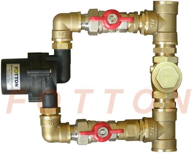 Awaryjna lub podstawowa niskonapięciowa grupa pompowa do systemów CO FOTTON AGP01 dostępna tylko u nas! Układ hydrauliczny posiada przelot główny 5/4"; bypass z pompą FOTTON FT5 1/2" Funkcja 1 - awaryjna grupa pompowa do systemów CO Awaryjna grupa pompowa do systemów CO z pompą prądu stałego FT5 FOTTON 15W DC. Pompa może być zasilana ze wszelkiego rodzaju źródeł niskonapięciowych 12 lub 24V DC czyli zasilaczy, akumulatorów w tym akumulatorów samochodowych, jak też paneli fotowoltaicznych FTM20 dzięki wbudowanemu sterownikowi solarnemu itp. Pompa posiada ekstremalnie niskie zużycie energii, przy 12V pobiera zaledwie ok 1A a przy 24V ok 0.5-0.6A. Wydajność pompy do 11l/min. Grupa została zaprojektowana jako awaryjne podtrzymanie obiegu w instalacjach CO z kotłami stałopalnymi jak też instalacjach kominkowych. W przypadku wystąpienia braku zasilania z sieci energetycznej, zatrzymania się pompy obiegowej 230V, grupa umożliwia dalszą pracę kotła bez ryzyka jego przegrzania i konieczności wygaszenia. Grupę montuje się szeregowo za podstawową obiegową grupą pompową . Zalecane jest stosowanie w takim przypadku montowanie zasadniczej grupy pompowej zasilanej 230V AC z zaworem różnicowym lub klapowym; montaż podstawowej pompy obiegowej bezpośrednio na rurociągu może spowodować zbyt duże opory w przypadku gdy podejmuje pracę pompa awaryjna FT5 FOTTON 12VDC, Prawidłowy montaż grup pompowych pokazano na załączonych schematach Funkcja 1 - podstawowa grupa pompowa do systemów CO Niskonapięciowa podstawowa grupa pompowa do systemów CO z pompą prądu stałego FT5 FOTTON 12V 15W DC. Pompa może być zasilana ze wszelkiego rodzaju źródeł niskonapięciowych 12 lub 24V DC czyli zasilaczy, akumulatorów w tym akumulatorów samochodowych, paneli fotowoltaicznych dzięki wbudowanemu sterownikowi solarnemu itp. Pompa posiada ekstremalnie niskie zużycie energii, przy 12V pobiera zaledwie 1-1.2A a przy 24V ok 0.5-0.6A i może pracować w sposób ciągły do 30 000h. Wydajność pompy do 11l/min. Grupa została zaprojektowana jako zasadnicze wymuszenie obiegu w instalacjach CO z kotłami stałopalnymi jak też instalacjach kominkowych. Grupę można montować wszędzie tam gdzie brak jest dostępu do zewnętrznej sieci energetycznej lub występują częste braki w dopływie prądu. Kolejnym zastosowanie jest montaż w budynkach czy instalacjach zasilanych z ekologicznych źródeł energii. Grupę wyposażono z specjalny zawór klapowy umożliwiający swobodny konwekcyjny przepływ czynnika grzewczego w przypadku zaniku zasilania lub wyłączenia pompy. Należy pamiętać iż w przypadku poziomego montażu grupy np na tzw powrocie należy zwrócić uwagę na to aby: - zawór klapowy był usytuowany nakrętką z wytłoczonymi literami H N pionowo ku górze - jest to wymagane w celu zapewnienia prawidłowej pracy zaworu, - prawidłowo ustawić pozycję pompy - napęd elektryczny pompy powinien znajdować się poniżej linii wejścia i wyjścia z pompy. Układ hydrauliczny posiada przelot główny 3/4"; bypass z pompą FOTTON FT5 1/2" Dostępne są również inne wersje grup. W sprzedaży znajdują się również ww grupy w komplecie z układami zasilania i automatyki sterującej stanowiące kompletne zasilanie rezerwowe. ZAPRASZAMY
