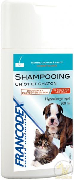 Od założenia firmy w 1985 roku Laboratoria FRANCODEX starają się zaspokoić potrzeby wszystkich właścicieli zwierząt domowych, proponując im szeroką i urozmaiconą gamę produktów do higieny i pielęgnacji m.in. psów, oraz kotów. Od samego początku powołaniem Laboratoriów FRANCODEX jest oferowanie – w ramach specjalistycznych punktów dystrybucyjnych – produktów stworzonych, by zapewniać zdrowie i dobre samopoczucie zwierząt domowych. FRANCODEX Łagodny szampon dla kociąt i szczeniakówŁagodnie myjący i nadający miękkości sierści szampon dla szczeniąt i kociąt. Nie szczypie w oczy i jest hipoalergiczny. Jego łagodna baza myjąca nie powoduje podrażnień skóry ani sierści. Polimery kationowe chronią sierść przed uszkodzeniami powstającymi pod wpływem działania czynników zewnętrznych. Zalecany również dla psów i kotów o wrażliwej skórze. Cechy charakterystyczne Specjalnie opracowany preparat dla wrażliwej skóry szczeniąt oraz kociąt. Odpowiedni także dla wrażliwych dorosłych psów i kotów. Delikatny dla oczu, skóry oraz sierści. Ma działanie hipoalergiczne. Przywraca sierści połysk i miękkość, a także ułatwia jej rozczesywanie. Zawiera wyciąg z rumianku, który działa zmiękczająco i polimery kationowe chroniące sierść przed uszkodzeniami atmosferycznymi a także ułatwiające rozczesywanie Zapewnia naturalny poziom nawilżenia. Oczyszcza sierść i pozostawia ją delikatnie pachnącą. Neutralne pH nie podrażnia wrażliwej skóry. Zapewnia delikatne oczyszczenie sierści. Sposób użycia Zmoczyć sierść letnią wodą. Nanieść szampon i masować do uzyskania piany. Pozostawić na kilka minut i dokładnie spłukać wodą. W razie konieczności zabieg powtórzyć. Chronić oczy, uszy i pysk pupila. Wielkość opakowania 200 ml