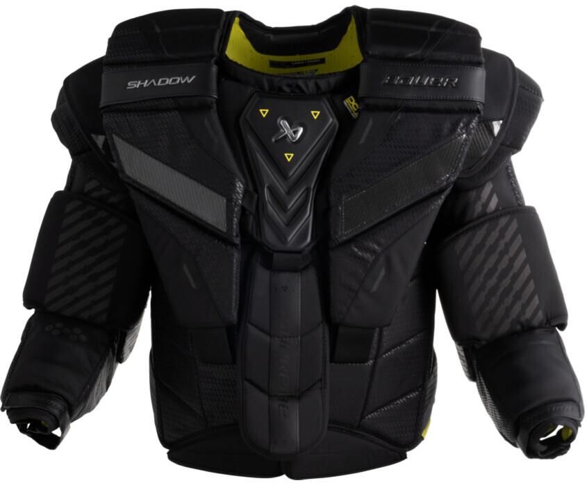 Kamizelka bramkarska Bauer Supreme Shadow Sr To najbardziej zaawansowany model kamizelki bramkarskiej z oferty BAUER, zapewniający zwiększoną mobilność, osłonę i ochronę. Dzięki nowemu hybrydowemu systemowi regulacji ochrony, zwiększyła się możliwość dopasowania ochrony brzucha. Idealna dla bramkarzy szukających najlepszej ochrony i komfortu. Główne cechy: Nowy system Hybrid Tuck Belly: Pozwala na noszenie ochraniacza brzucha na różne sposoby: możliwość włożenia/wyjęcia/brak Zapewnia skuteczną ochronę i płynną integrację ze spodniami. CURV® Composite: Oferuje doskonałe dopasowanie i ochronę. Osłony naramienne CURV® Composite wyposażone są w pętle, które ułatwiają integrację szelek. Defense Cloud Tech Sternum: Pianka DCT w mostku pochłania uderzenia krążka, zapewniając idealną ochronę przed każdym strzałem. Airflow Spinal 2.0: Zwiększony przepływ powietrza pozwala zachować chłód na lodzie. HingeArm 3.0: Ulepszone ramiona HingeArm 3.0 zapewniają zwiększony zakres ruchu i lepszą mobilność w porównaniu do wcześniejszych modeli ochraniaczy klatki piersiowej SUPREME MACH. Kamizelka Supreme Shadow Sr to idealny wybór dla bramkarzy poszukujących najwyższej jakości ochrony i komfortu, które pozwolą im osiągnąć najlepsze wyniki na lodzie