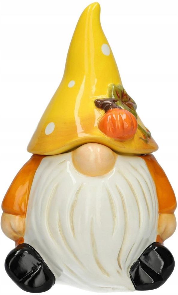 Pojemnik stojący kuchenny krasnal skrzat święta cukierki (17688) Ceramiczny pojemnik stojący w kształcie krasnala z jesiennymi zdobieniami Witaj w magicznym świecie leśnych skrzatów! Ceramiczny pojemnik w kształcie krasnala to prawdziwa perełka, która przeniesie Cię do baśniowej krainy pełnej jesiennych kolorów i ciepła. Ten uroczy krasnal o pojemności 400 ml (pojemność liczona po rant pojemnika) nie jest zwykłym pojemnikiem – to strażnik Twoich skarbów, gotowy przechowywać wszystko, co tylko zechcesz, od ulubionych herbat po drobne przekąski. Krasnal ubrany jest w pomarańczowy kubraczek, który mieni się jak liście opadające w jesiennym lesie, a jego długa, kremowa broda spływa miękko na dół, dodając mu dostojności. Jego żółta czapka zdobiona dynią i jesiennym listkiem to prawdziwy klejnot, jakby wprost wypleciony z opowieści o złotej porze roku. Czapka skrzata nie tylko przyciąga wzrok, ale także pełni funkcję pokrywki, dzięki której pojemnik chroni swoje wnętrze jak tajemnicę. Trójwymiarowy wygląd sprawia, że ten pojemnik to nie tylko praktyczny element, ale i prawdziwy amulet na Twoim stole. Wyobraź sobie, jak ten krasnal strzeże Twoich przypraw, słodyczy czy herbat – każda rzecz zyskuje odrobinę magii. Zaproś tego uroczego skrzata do swojego domu i pozwól mu wprowadzić baśniową atmosferę pełną jesiennych kolorów. Niech jego "dyniowa" czapka i urok przypominają Ci, że w codzienności zawsze kryje się trochę magii, jeśli tylko potrafisz ją dostrzec! Wzór: 730400200 Produkt 1 x pojemnik Wymiary wysokość z pokrywką 18,5 cm wysokość bez pokrywki 10 cm średnica wlotu pojemnika 6,7 cm długość 10,5 cm pojemność pojemnika 400 ml Materiał ceramika Użytkowanie dopuszczone do kontaktu z żywnością