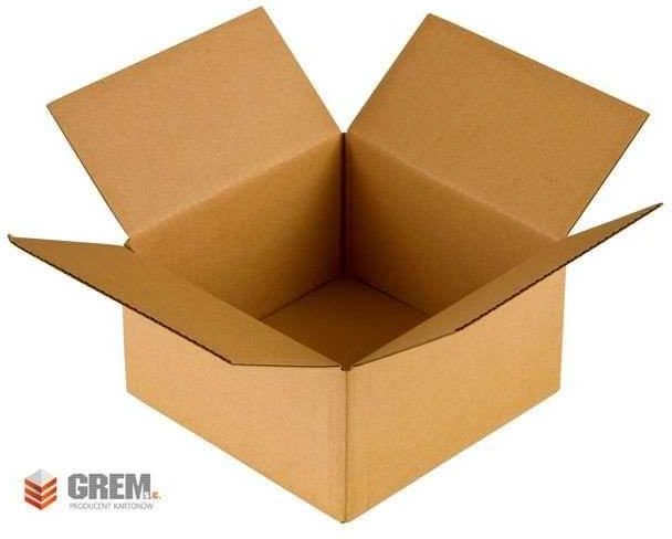 Komplet 20 szt. szarych pudeł kartonowych klapowych o wymiarach zew. 350x350x150 mm (dł/szer/wys). Opakowania wykonane są z trzywarstwowej tektury falistej (fala B) o gramaturze 380 g/m2.