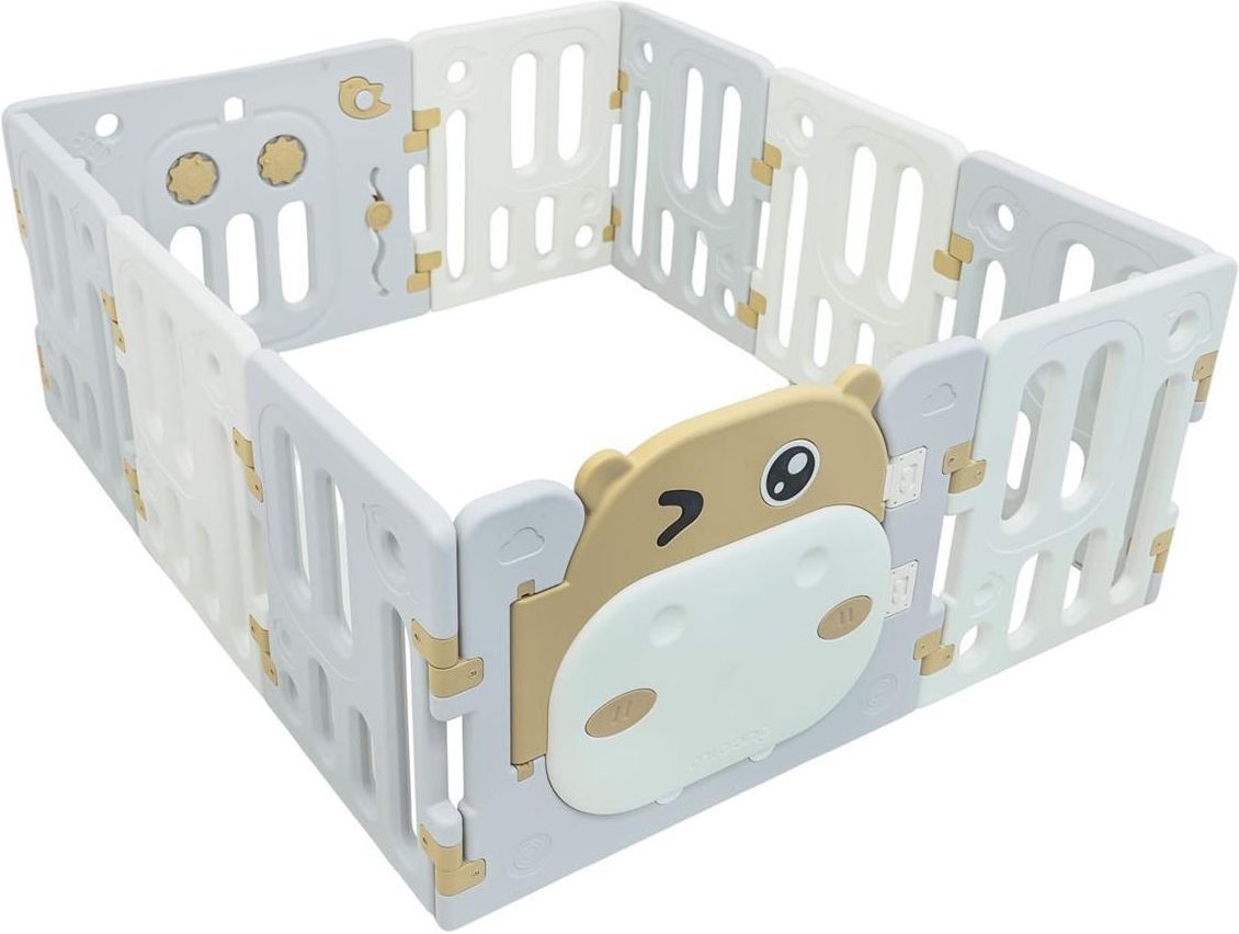 Opis Kojec Modułowy Hipcio Brązowy Duży, praktyczny, składany kojec modułowy dla dziecka od-6 go miesiąca życia. Z kojca możemy ułożyć dowolną konstrukcję, według własnych upodobań, bardzo łatwo się składa i rozkłada, jest stabilny i posiada gładkie krawędzie. Wnętrze kojca wyposażono w manipulacyjne elementy takie jak przesuwane kółeczko, zębatki, piszczałkę czy kierownicę. Zestaw wykonano z trwałych i nietoksycznych materiałów, składa się z 10 paneli. Panel drzwi blokuje się, na zewnątrz uniemożliwiając otwarcie drzwi przez dziecko. Antypoślizgowe nóżki zapobiegają przesuwaniu się kojca. W kojcu twój maluszek będzie mieć wystarczającą ilość miejsca do swobodnego przemieszczania się, a jednocześnie będzie bezpieczny. W zestawie znajduje się również kosz na piłeczki i 40 piłeczek. Funkcje zestawu: - odpowiedni dla dzieci powyżej 6-go miesiąca życia, - możliwość zbudowania dowolnej wielkości kojca według własnych upodobań, - elementy manipulacyjne wewnątrz kojca: przesuwane kółeczka, zębatki, piszczałka w ptaszku i kierownicy, obrotowa kierownica. - wykonany z trwałych i nietoksycznych materiałów, - blokada drzwi na zewnątrz, - antypoślizgowe nóżki, - łatwo się składa i rozkłada, - kosz na piłeczki i piłeczki w zestawie. Wymiary - kojec ok. 128 cm x 150 cm x 63 cm, - kosz na piłeczki ok. 47 cm x 29 cm x 24 cm, - średnica piłeczki ok. 7,5 cm, - opakowanie ok. 106,5 cm x 67,5 cm x 26,5 cm. Zawartość zestawu - 10 paneli kojca, - 40 piłeczek, - instrukcja montażu