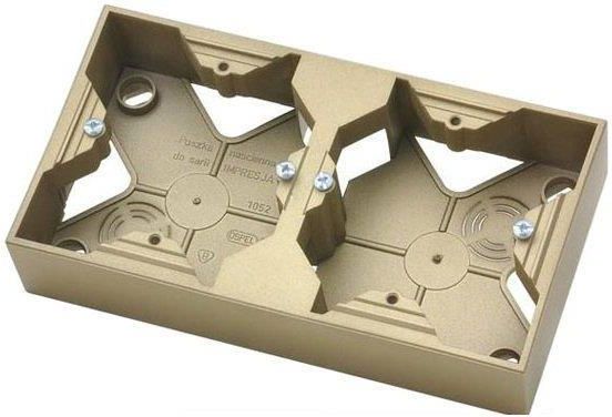 Puszka naścienna do serii podwójnej szampański złoty SONATA OSPELSeria podtynkowa Sonata należy do osprzętu modułowego co oznacza że do każdego osprzętu należy dokupić osobno ramkę, według upodobania osprzęt można łączyć z ramkami jedno lub wielokrotnymi, pionowymi lub poziomymi.Seria Sonata bez …