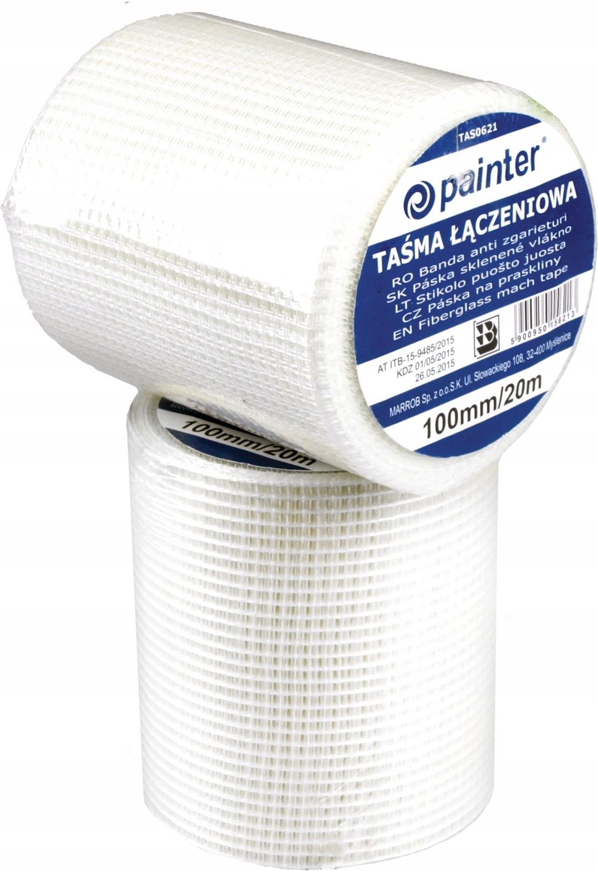 PAINTER Taśma Antyrysowa Siatka 150mm/20m do Płyt Gipsowych Regips Znajduje zastosowanie przy maskowaniu połączeń w płytach karton-gips, a także do naprawy zarysowań oraz pęknięć tynków na ścianach i sufitach przed malowaniem lub tapetowaniem. Taśma na bazie włókna szklanego jednostronnie klejąca. …