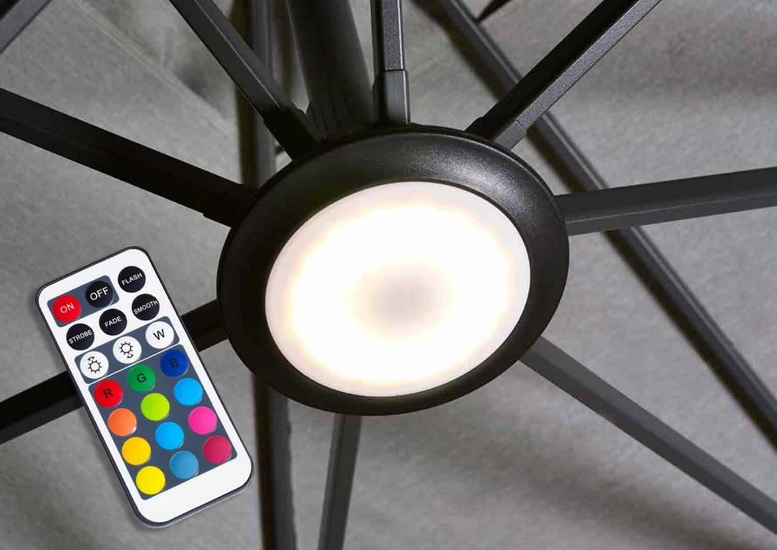 Oświetlenie LED RGB dedykowane dla parasoli PLATINUM® z boczną nogą. W zestawie pilot zdalnego sterowania i ładowarka USB. Oświetlenie posiada 4 różne tryby i 10 różnych opcji kolorystycznych.