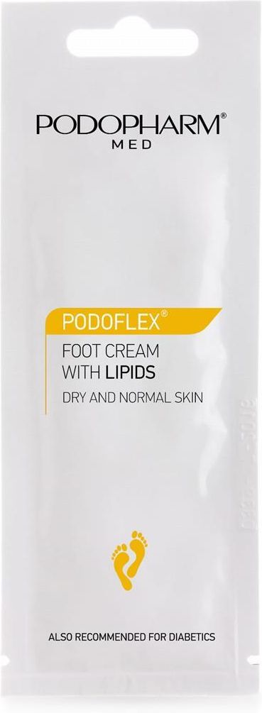 PODOPHARM PODOFLEX® krem do stóp z lipidami, 10 ml Wskazania : Do codziennej pielęgnacji stóp z tendencją do przesuszania się. Polecany dla diabetyków. Działanie : Bogata, regeneracyjna formuła kremu to efekt połączenia naturalnych tłuszczów: masła Shea, wegańskiej lanoliny Lipex L'sens i wosku ze skórki pomarańczowej oraz olejów: konopnego i sojowego. Preparat zawiera ekstrakty z nagietka, szałwii, wodnej mięty oraz witaminę E. Alantoina łagodzi podrażnienia i wspomaga odnowę uszkodzonego naskórka. A naturalny olejek z mandarynki i mięty nadaje preparatowi przyjemny, egzotyczny aromat. Krem idealnie się wchłania, pozostawiając skórę stóp delikatną i gładką. Sposób użycia : Odpowiednią ilość preparatu nałożyć na stopy. Następnie wmasować aż do całkowitego wchłonięcia. Stosować według potrzeb. Pojemność : 10 ml