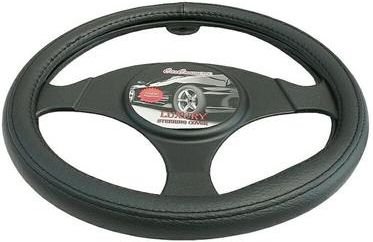 Pokrowiec na kierownicę 37-39,5cm Luxury czarnyStylowy pokrowiec na kierownicę wykonany z eko-skóry. Zapewnia dłoniom komfortową temperaturę oraz zwiększa komfort prowadzenia pojazdu. Ponadto chroni kierownicę przed przetarciem. Pokrowiec pasuje do wszelkich pojazdów z kierownicą o średnicy 37-39,5cm (14,5" - 15,5").