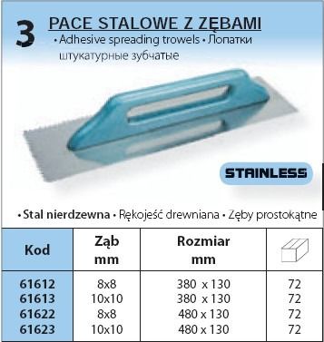 Stal nierdzewna Rękojeść drewniana zamknięta Zęby prostokątne Do nakładania kleju przy pracach glazurniczych (ząb 6 x 6 i 8 x 8), przy układaniu parkietów, przy rozprowadzaniu zaprawy murarskiej (ząb 10 x 10) Parametry: Marka: POLSKA Waga : 0.583