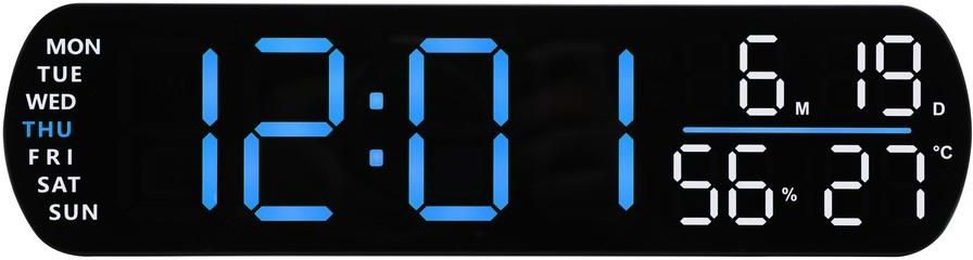 Zegar budzik sieciowy z niebieskimi cyframi LED, termometrem, higrometrem, stoperem, timerem. Długość 26 cm. Cyfry 5 cm. Alarm / budzik. Czytelny budzik zegar stołowy szafkowy do biura pokoju salonu. Dni tygodnia w języku angielskim