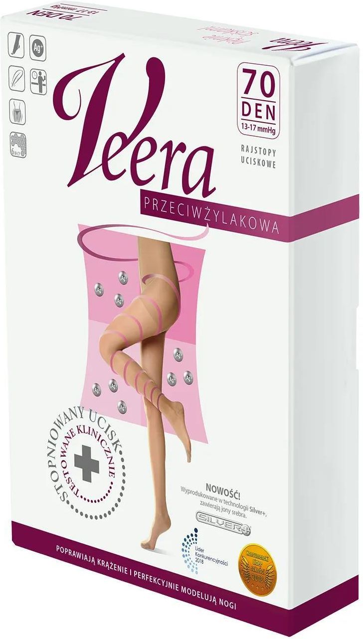 Jak prać produkty kompresyjne Veera Przeciwżylakowa? Rajstopy uciskowe najlepiej prać ręcznie, w wodzie o temperaturze nieprzekraczającej 30°C. Nie chlorować. Nie prasować. Nie prać chemicznie. Nie suszyć mechanicznie. Przestrzeganie powyższych zasad pozwoli na zachowanie wszystkich właściwości materiału. 1 para Kati Sp. z o.o. ul. Poznańska 553C 05-860 Święcice Poliamid 78%, elastan 22%. Przed użyciem zapoznaj się z treścią instrukcji używania i etykietą bądź skonsultuj się z lekarzem. Veera Przeciwżylakowa rajstopy uciskowe są wyrobem medycznym odpowiednim do stosowania w profilaktyce żylaków. Noszone regularne rajstopy marki Veera pozwolą odzyskać uczucie lekkości nawet najbardziej zmęczonym nogom. Zastosowany do produkcji wyrobu materiał oraz stopniowana kompresja przynoszą ulgę w przypadku bólu nóg i opuchliźnie pojawiających się pod koniec dnia. Rajstopy uciskowe — jak działają? Rajstopy przeciwżylakowe stosowane są w kompresoterapii, czyli terapii uciskowej, która jest wygodna i łatwa do wdrożenia przez osoby narażone na powstawanie żylaków. Skuteczność kompresoterapii w znacznym stopniu zależy od poprawnego doboru rozmiaru rajstop uciskowych. Wysokiej jakości rajstopy Veera Przeciwżylakowa o grubości 70 den i stopniowym ucisku 13-17 mmHg są odpowiednie dla osób, które chcą uchronić swoje nogi przed pojawieniem się zmian żylnych, pękających naczynek, jak również dla wszystkich, którzy odczuwają ból nóg związany z trybem wykonywanej pracy. Rajstopy sprawdzą się zwłaszcza w przypadku bolących i spuchniętych nóg oraz obrzęku w okolicy kostki, który ustępuje po przespanej nocy. Rajstopy z uciskiem 13-17 mmHg (70 DEN) ze stopniowaną kompresją: poprawiają krążenie, redukują obrzęk, niwelują uczucie ciężkości nóg. Uciskowe rajstopy Veera Przeciwżylakowa są testowane klinicznie. Stopniowany ucisk skierowany od kostki ku górze jest doskonałym wsparciem dla pracy żył pompujących krew do serca. Wykonane z przyjemnego w dotyku materiału w neutralnym odcieniu Visone rajstopy przeciwżylakowe w rozmiarze 5 z dużym klinem dodatkowo wyszczuplają i modelują sylwetkę, dzięki czemu podczas noszenia możesz poczuć się wygodnie i kobieco. Rajstopy marki Veera pomimo, że są wyrobem medycznym, nie różnią się stosowaniem od klasycznych rajstop. Splot plastra miodu zapewnia włóknom odpowiednią wytrzymałość, dzięki której zachowują właściwości uciskowe przez co najmniej 6 miesięcy. Materiał jest przy tym przewiewny również latem. Dodatkowo zaznaczona pięta pozwala na prawidłowe rozmieszczenie ucisku, a zastosowana technologia Silver+ z jonami srebra gwarantuje odpowiednią higienę, ochronę i świeżość przez cały okres użytkowania. Wyprodukowano we Włoszech: Tex Life s.r.l. 25122 Brescia (BS) Via Soferino 11 Wyrób medyczny Klasy I zgodny z dyrektywą EU 93/42/EEC. Uciskowe rajstopy przeciwżylakowe do codziennego noszenia. Odpowiednie w profilaktyce przewlekłej niewydolności żylnej u osób wykonujących pracę stojącą. Ucisk profilaktyczny 13-17 mmHg. Grubość 70 den. Odcień Visone. Dzianina wzbogacona jonami srebra (technologia Silver+). Materiał z właściwościami antybakteryjnymi. Precyzyjne strefy ucisku. Zaznaczona pięta gwarantująca prawidłowe rozmieszczenie ucisku. Anatomicznie dziane. Splot plastra miody gwarantujący zapewnienie właściwości uciskowych przez co najmniej 6 miesięcy. Materiał wyszczupla i modeluje sylwetkę. Rozmiar 5/XXL z dużym klinem (waga 80-90 kg, wzrost 170-182 cm).