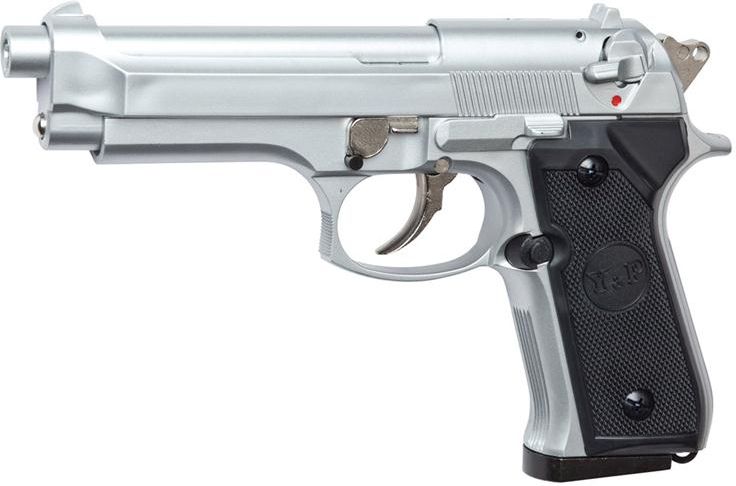 Ciężka, wykonana z tworzywa ABS replika jednego z najpopularniejszych modeli pistoletów używanych przez amerykańskie wojsko i przez to obecnego w wielu hollywoodzkich produkcjach. Szkielet oraz lufę wykonano z metalu, co zwiększa wagę repliki i nadaje jej wrażenia autentyczności. Posiada magazynek umieszczany w rękojeści - jego pojemność to 21 kulek kalibru 6 mm. Replika ta jest napędzana green gazem i nadaje kulkom prędkość ok. 250 fps. Dużą prędkość początkową kulki oraz celność uzyskano dzięki zastosowaniu hop hp - systemu podkręcenia kulki w lufie, przez co nadany zostanie jej ruch obrotowy, podobny do pocisku wystrzelonego z lufy gwintowanej. Spust działa w trybie DA (double action), co oznacza, że ściągnięcie spustu zwalnia poprzednio napięty kurek. Oczywiście sam kurek może być napięty kciukiem. Zarówno kurek, jak i sam język spustowy także wykonano z metalu. Przyrządy celownicze, to stała muszka oraz szczerbinka. W zestawie z pistoletem otrzymujemy podstawową paczkę kulek. Produkt objęty jest 6-miesięczną gwarancją. Dane techniczne: Kolor: silver Napęd: green gaz Kaliber: 6 mm Waga: 775 g Długość: 217 mm Długość lufy: 80 mm Prędkość początkowa: 250 fps Pojemność magazynka: 21 kulek Producent: Action Sport Games, Dania
