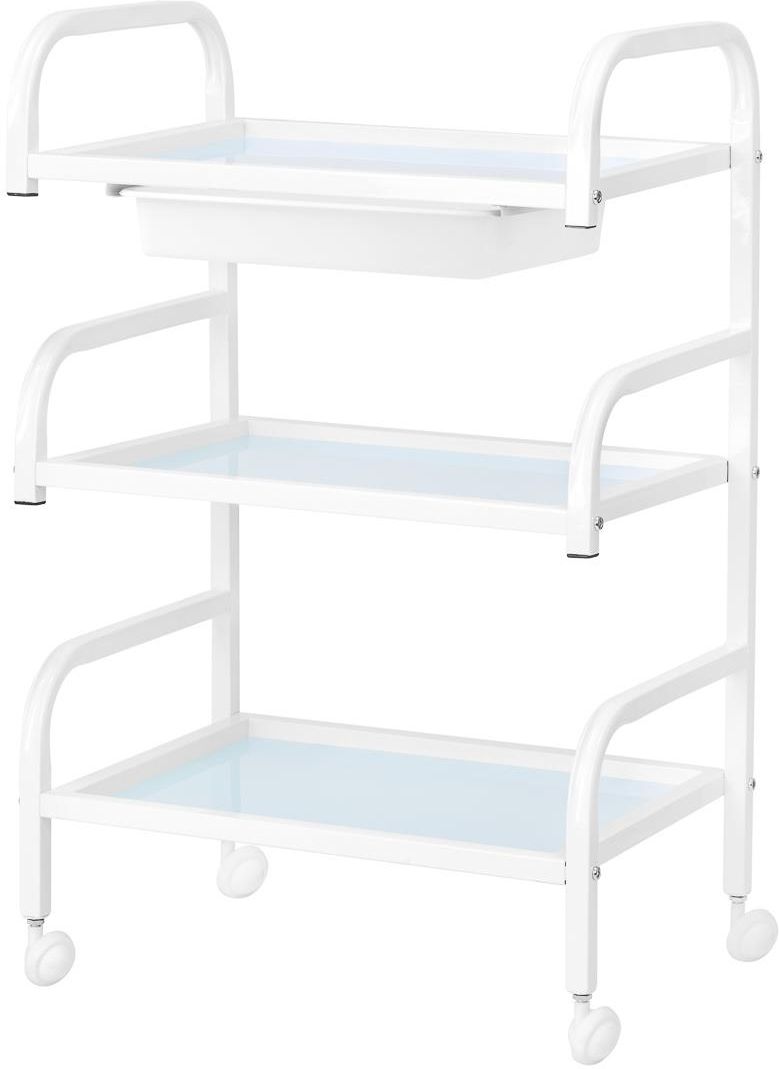 Marka ACTIVESHOP od wielu lat oferuje szeroką gamę produktów, które sprawdzają się w profesjonalnym użytku w wielu branżach. W dostępnym asortymencie można znaleźć artykuły z różnych kategorii, od drobnych, niezbędnych akcesoriów, po specjalistyczne wyposażenie. Praktyczny pomocnik kosmetyczny Pomocnik kosmetyczny Basic 121 to funkcjonalny mebel, który doskonale sprawdzi się w każdym salonie kosmetycznym czy gabinecie SPA. Lekka konstrukcja ułatwia codzienną pracę, a trzy szklane półki zapewniają wygodne przechowywanie kosmetyków, akcesoriów i sprzętu. Dodatkowa kuweta pod górną półką umożliwia szybki dostęp do najczęściej używanych narzędzi. Minimalistyczny design dodaje wnętrzom profesjonalnego charakteru. Design dla wygody użytkowania Stelaż z trwałego aluminium w odcieniach bieli oraz szklane półki tworzą nowoczesną i estetyczną całość, którą łatwo utrzymać w czystości. Cztery kółka zapewniają mobilność, co ułatwia organizację przestrzeni roboczej, a solidne materiały gwarantują stabilność i długie użytkowanie. Wymiary zostały podane na zdjęciu. Kolor: odcienie bieli
