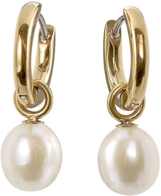 eleganckie kolczyki dla kobiet wykonane z polerowanego czystego tytanu, pozłacane jonami złota, przyjazne dla skóry i hipoalergiczne, wymienna zawieszka z hodowlaną perłą słodkowodną, logo grawerowane laserowo, grubość 2,5 mm, średnica zewnętrzna 12,5 mm, długość całkowita 20 mm