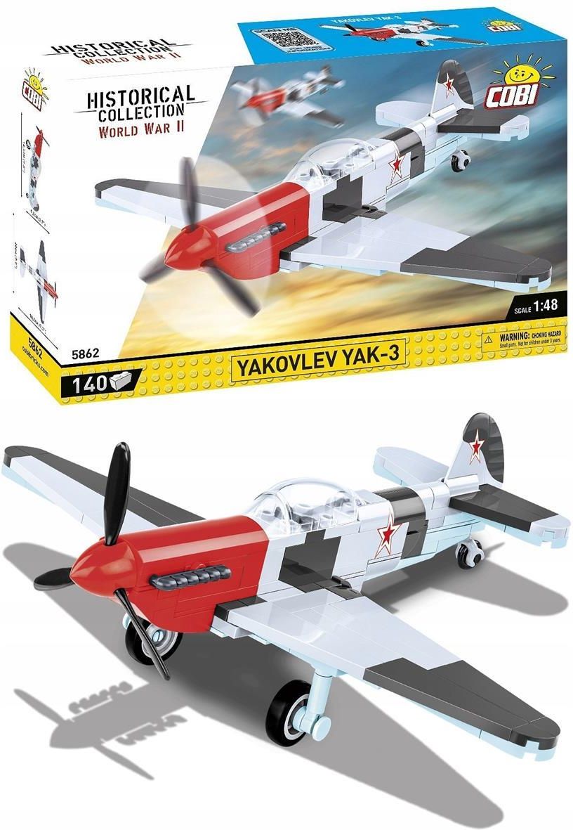KLOCKI COBI 5862 SAMOLOT Yakovlev Yak-3 MYŚLIWIEC + PŁYTKA KONSTRUKCYJNA SPECYFIKACJA PRODUKTU: Marka: Cobi Seria: Historical Collection World War II Ilość elementów: 140 szt. Ruchome elementy: Tak Wymiary modelu (dł./szer./wys.): 18.5 cm / 20 cm / 9.5 cm Skala modelu: 1:48 Wymiary opakowania …