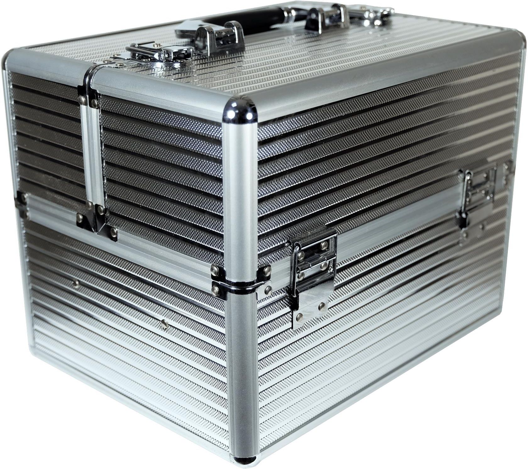 Kuferek kosmetyczny wysokiej jakości, profesjonalny i wytrzymały. Polecany do transportu i przechowywania kosmetyków, lamp UV, frezarek etc. Kuferek kosmetyczny w kolorze srebrnym, chropowaty. Kuferek jest rozkładany, w środku znajdują się: 2 rozkładane półeczki na lakiery (jedna półeczka mieści 24 lakiery, kratka jest wyjmowana) o wymiarach: 15 x 21,5 x 4,5 cm wyjmowana półeczka o wymiarach 21,5 x 30,5 x 4,5 cm komora dolna (np: na lampę UV, frezarkę) o wymiarach: 23x 31,5 x 9 cm Do kuferka dołączone są 2 kluczyki.