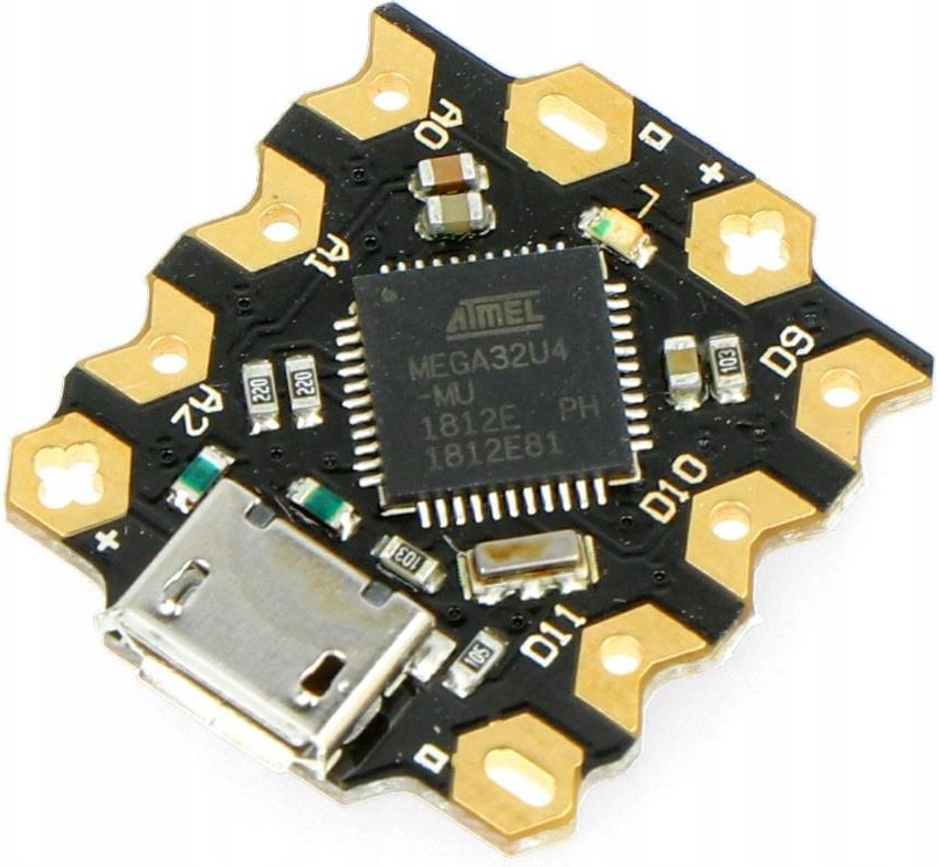 DFRobot Beetle – miniaturowa płytka z mikrokontrolerem ATmega32U4 Opis Beetle to miniaturowa płytka (20 x 22 mm) z mikrokontrolerem ATmega 32U4. Posiada 10 wejść/wyjść cyfrowych, niektóre z nich mogą być używane jako wejścia analogowe lub wyjścia sygnału PWM. Programowanie odbywa się przy pomocy środowiska Arduino IDE. Płytka ma gniazdo microUSB, które służy do programowania przy użyciu wgranego Bootloadera lub zasilania płytki. W sprzedaży jest dostępny również Beetle Shield, który rozszerza płytkę Beetle o złącza goldpin umożliwiające podłączenie serwomechanizmów lub czujników. Uwaga! Podczas programowania przy użyciu Arduino IDE należy wybrać rodzaj płytki na Arduino Leonardo. Właściwości Mikrokontroler ATmega 32U4 Pamięć Flash: 32 KB (4 KB zajęte przez bootloader) Pamięć SRAM 2,5 KB Pamięć EEPROM: 1 KB Częstotliwość pracy: 16 MHz Ilość wejść/wyjść cyfrowych: 10 Wyjścia sygnału PWM: 4 Wejścia analogowe: 5 Interfejsy: UART, I2C 2 porty zasilające Złącze ICSP do programowania ICSP Złącze microUSB do programowania oraz zasilania Wymiary: 20 x 22 x 3,8 mm