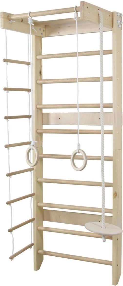 Drabinka gimnastyczna Skandi Drabinka gimnastyczna Skandi to doskonałe rozwiązanie dla dzieci i dorosłych, którzy chcą rozwijać swoją sprawność fizyczną w domowym zaciszu. Jej skandynawski design, wysoka jakość wykonania oraz kompaktowe wymiary sprawiają, że świetnie wpisuje się w nowoczesne wnętrza. Drabinka została wyposażona we wszystkie niezbędne akcesoria gimnastyczne urozmaicające zabawę i ćwiczenia: drabinka linowa, kółka gimnastyczne i talerz huśtawka. ELEMENTY ZESTAWU drewniana drabinka gimnastyczna lina z siedziskiem: 240 cm kółka gimnastyczne drewniane drabinka linowa WAZNE Zestaw przeznaczony dla dzieci o wadze powyżej 20 kg oraz dorosłych Zalecenia producenta: dzieci powinny ćwiczyć tylko pod nadzorem rodziców Tylko do użytku domowego Maksymalne obciążenie drabinki: 120 kg Maksymalne obciążenie akcesoriów: 60 kg Szerokość całkowita: 800 mm Wysokość: 225 cm Odstęp między szczeblami: 18 cm Średnica szczebli: 38 mm