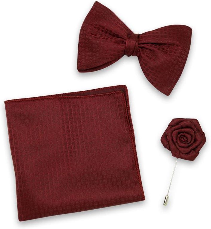 Komplet składający się bordowej muchy męskiej, poszetki i szpilki do marynarki
