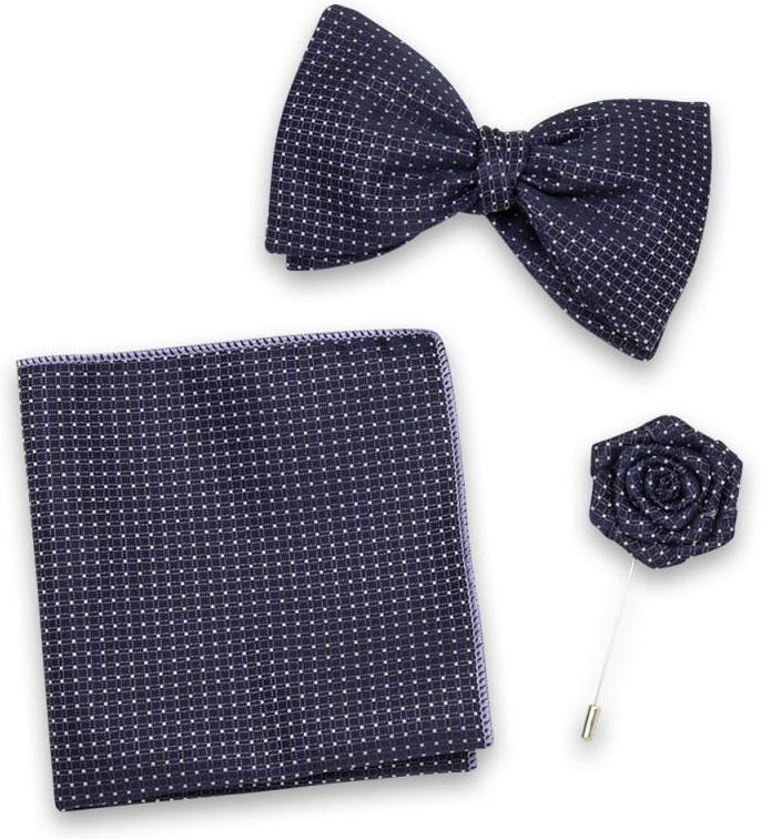 Komplet składający się granatowej muchy męskiej, poszetki i szpilki do marynarki we wzór w kratkę i kropki