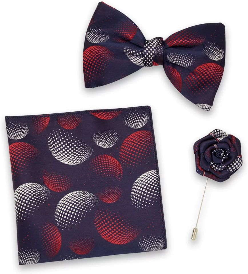 Komplet mucha, poszetka i szpilka Zestaw składający się z zawiązanej muchy męskiej, poszetki i szpilki do marynarki. Mucha posiada wygodne zapięcie na pasku oraz regulację obwodu. Elegancko zapakowany zestaw jest również idealnym pomysłem na prezent. - Kolor: granatowa w biały i czerwony kropkowany wzór - Tkanina: 100% mikrofibra - Wymiary muchy męskiej: 11 cm szer. x 5,5 cm wys. - Obwód muchy męskiej: regulacja 25 cm - 45 cm - Wymiary poszetki: 23 cm x 23 cm po rozłożeniu - Opakowanie: kartonowe pudełko Willsoor - Gwarancja: 2 lata - Wyprodukowano w UE