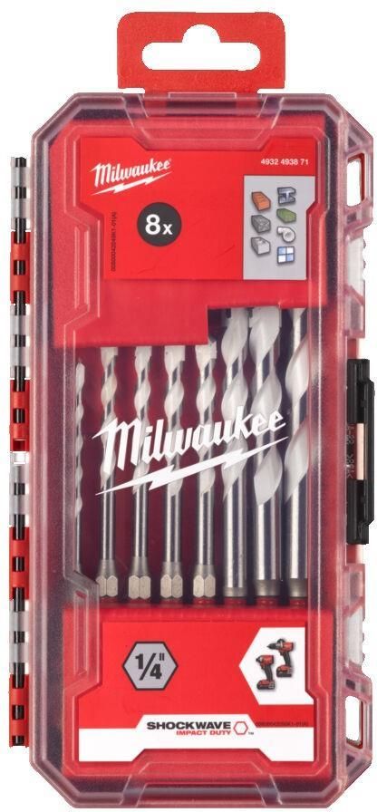 MILWAUKEE 4932493871 Zestaw wierteł uniwersalnych udarowych 4-12 MM 8 szt. Profesjonalny zestaw wierteł uniwersalnych udarowych MILWAUKEE został zaprojektowany z myślą o maksymalnej wszechstronności. Dzięki specjalnej konstrukcji umożliwia wiercenie w wielu różnych materiałach – od betonu, cegły i kamienia, po drewno, metal czy tworzywa sztuczne. Idealny wybór zarówno dla profesjonalistów, jak i majsterkowiczów. Oryginalny produkt marki MILWAUKEE. Zestaw wierteł Shockwave uniwersalnych, 4 - 12 mm (8 szt.). Wiertła z końcówką z węglika wolframu (TCT) do stosowania w narzędziach udarowych. Do stosowania w zakrętarkach udarowych oraz we wszystkich rodzajach narzędzi z uchwytami 3-szczękowymi takich jak wiertarki/wiertarko-wkrętarki standardowe oraz wiertarko-wkrętarki udarowe. Uchwyt sześciokątny w przypadku wierteł o długości całkowitej do 260 mm, uchwyt sfazowany z 3 stron w przypadku dłuższych. Wiertła z końcówką z węglika wolframu (TCT) umożliwiają wiercenie: w betonie, cegle, dachówkach, bloczkach z gazobetonu, cienkim metalu, aluminium, płytkach ceramicznych o niskiej i średniej twardości, we wszystkich rodzajach drewna i PCW. Białe żłobienie ułatwiające wyszukanie wiertła w skrzynce narzędziowej. DANE TECHNICZNE Zakres zestawu: ⌀ 4 x 100 mm, ⌀ 5 / 5 / 6 / 6 x 108 mm, ⌀ 8 / 10 x 120 mm, ⌀ 12 x 150 mm Typ: uniwersalne Zastosowanie do materiału: uniwersalne Czy zestaw: tak Ilość elementów: 8 Opakowanie: kaseta Uchwyt: 1/4" Hex