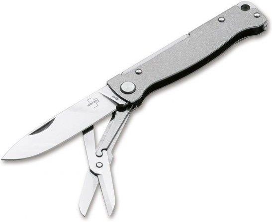 Nóż Böker Plus Atlas Multi SW Stan: Nowy Waga (kg): 0,12 Nieskomplikowany Boker Plus Atlas Multi to niezawodny scyzoryk z przegubem wsuwanym z korpusem ze stali nierdzewnej z wykończeniem stonewash. Minimalistyczna konstrukcja jest niezwykle wytrzymała i sprawia, że ten poręczny nóż jest idealnym towarzyszem w każdej sytuacji. Satynowe ostrze droppoint wykonane z 12C27 jest otwierane przez nacięcie gwoździa i z łatwością radzi sobie ze wszystkimi codziennymi zadaniami związanymi z cięciem. Atlas Multi jest również wyposażony w praktyczne nożyczki. Z otworem na smycz i klipsem (do góry/p).
