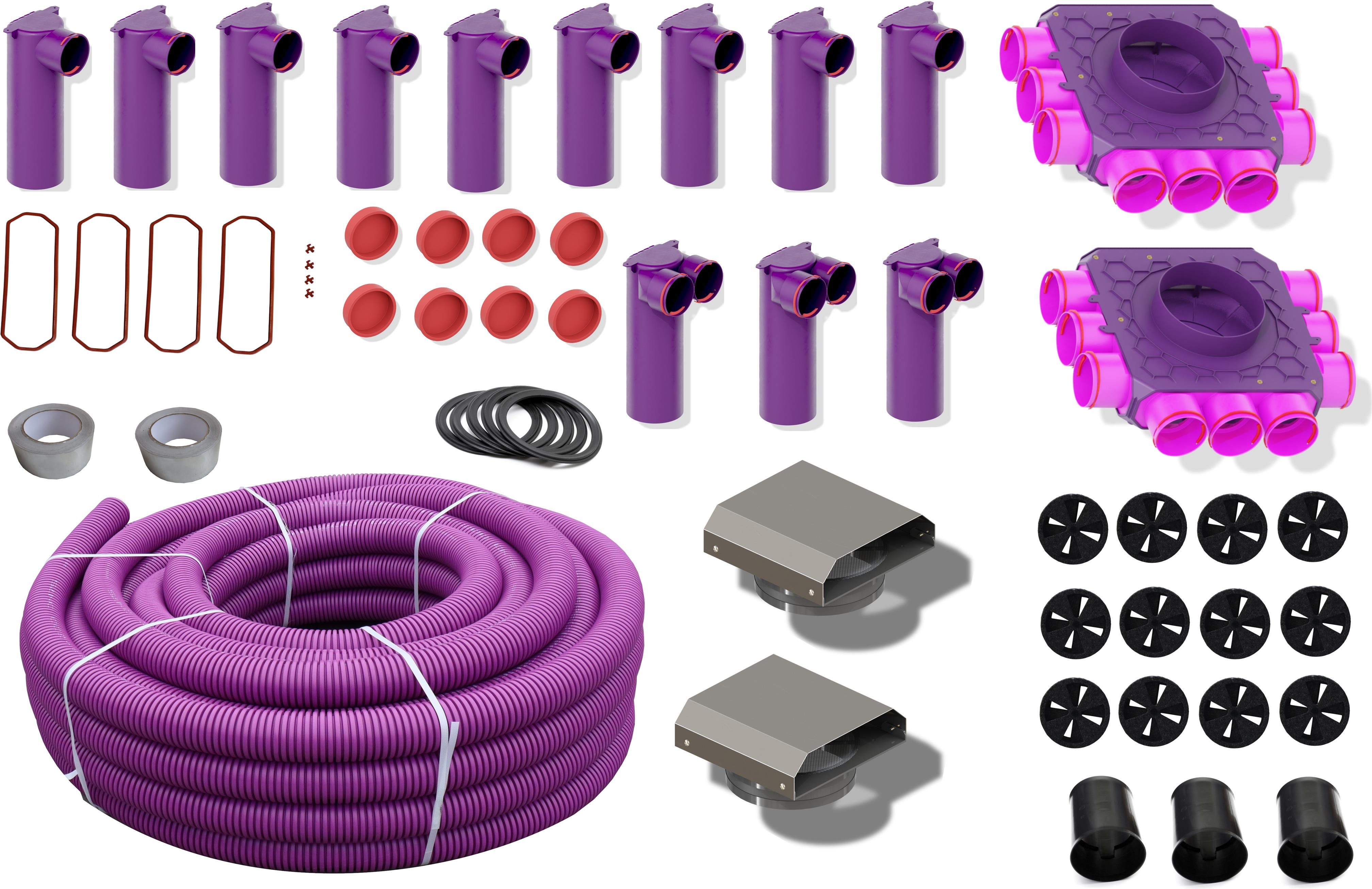 Zestaw MAX-VENT 120-150 Zestaw elementów rekuperacji mechanicznej do samodzielnego montażu dla domu parterowego (1 kondygnacja) o powierzchni 120-150 m2 Wykonany na instalacji o średnicy 90mm W skład zestawu wchodzi Rura wentylacyjna z powłoką antybakteryjną (30 ppm Ag) 90mm - 100 mb (2 krążki) …