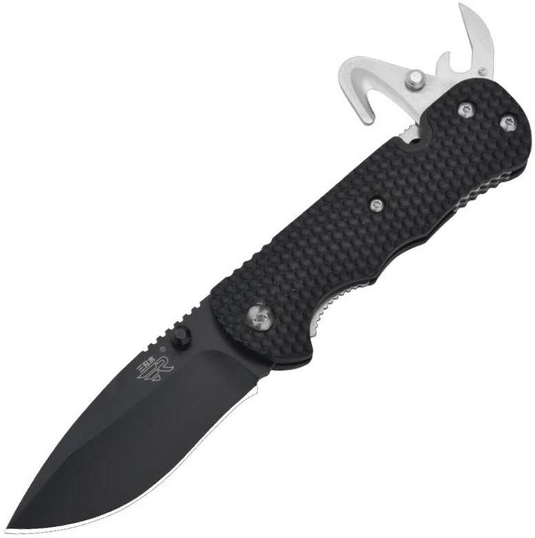 Składany nóż EDC wyposażony w głownię o profilu Drop-Point, wykonaną ze stali nierdzewnej 8Cr13MoV, pokrytą czarną powłoką ochronną. Okładziny wyprofilowanej rękojeści z wyraźnie zaznaczonym wycięciem na palec wykonano z poliamidu wzmocnionego włóknem szklanym.
