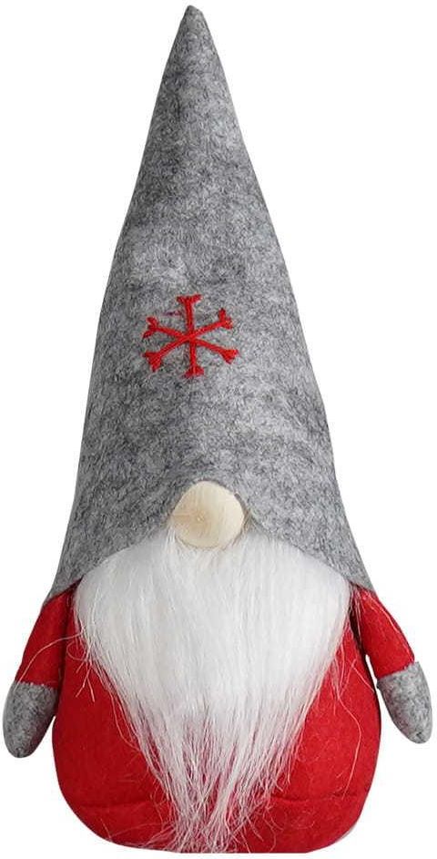 Skrzat z filcową czapką - duży Czerwony skrzat dekoracyjny z dużą szarą czapą i białą puchatą brodą. Na szarej czapce znajduje się wyszywany czerwoną nicią płatek śniegu. Ozdoba wykonana z filcu. Nos skrzata wykonano z drewna. Dekoracja stojąca, dół ozdoby został obciążony, aby umożliwić stabilne jej postawienie. Wysokość skrzata: 25 cm.